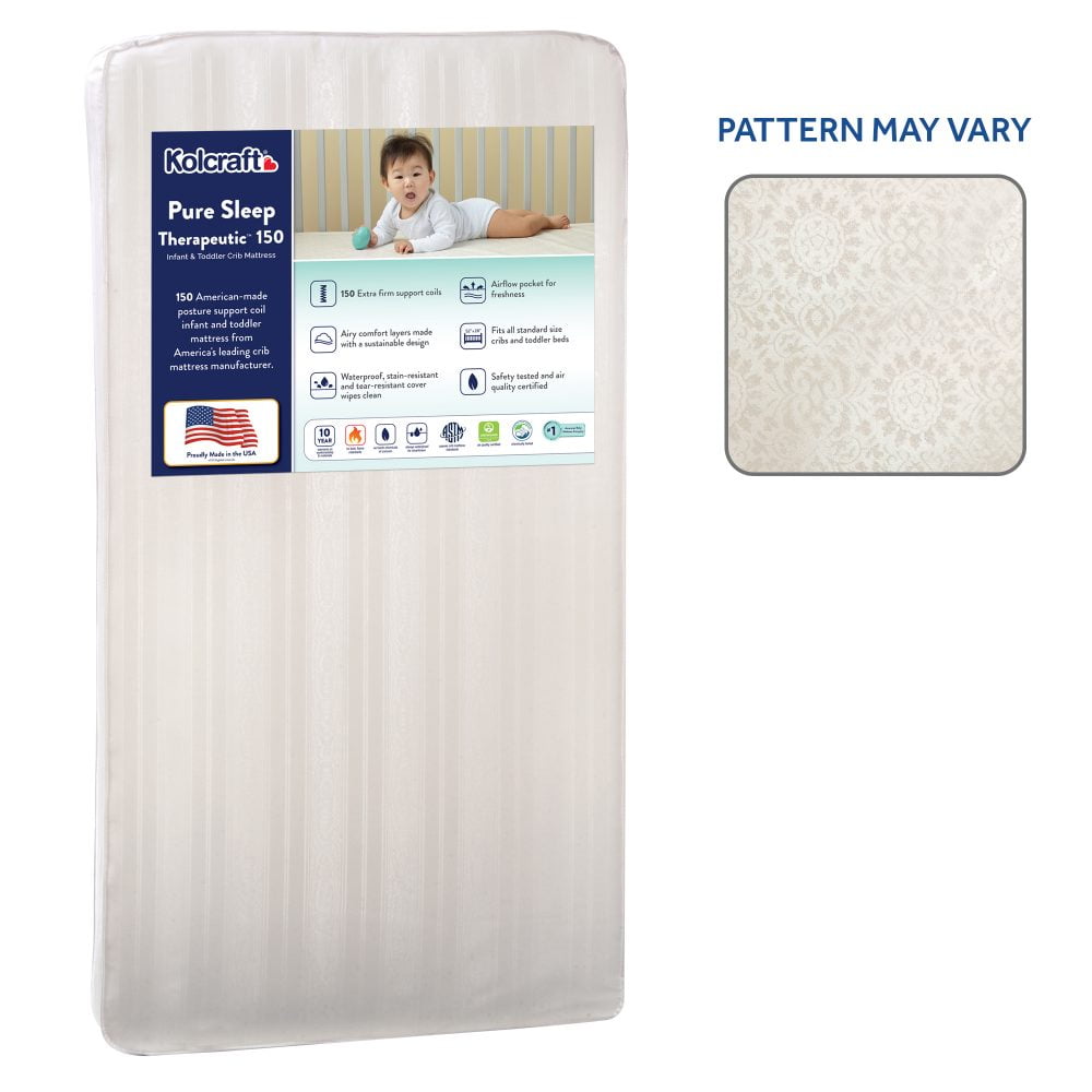 $51.59Kolcraft is a family owned and operated baby gear company. The Kolcraft Pure Sleep Therapeutic 150 crib mattress is an extra firm baby and toddler mattress with 150 durable coil springs, a waterproof surface and comfy cushioning throughout. The entire mattress passes GREENGUARD GOLD certification and ASTM crib mattress standards helping to ensure top quality and safety features. The mattress core is durability tested for years of use and carries a 10 year warranty on workmanship and materials. Use this mattress in your infant’s crib as well as your child’s toddler bed as he or she grows. The waterproof cover is reinforced to help prevent tearing and the entire surface and lock-stitched binding won’t allow leaks to seep inside the mattress surface. This offers an easy-clean, wipe-clean surface.