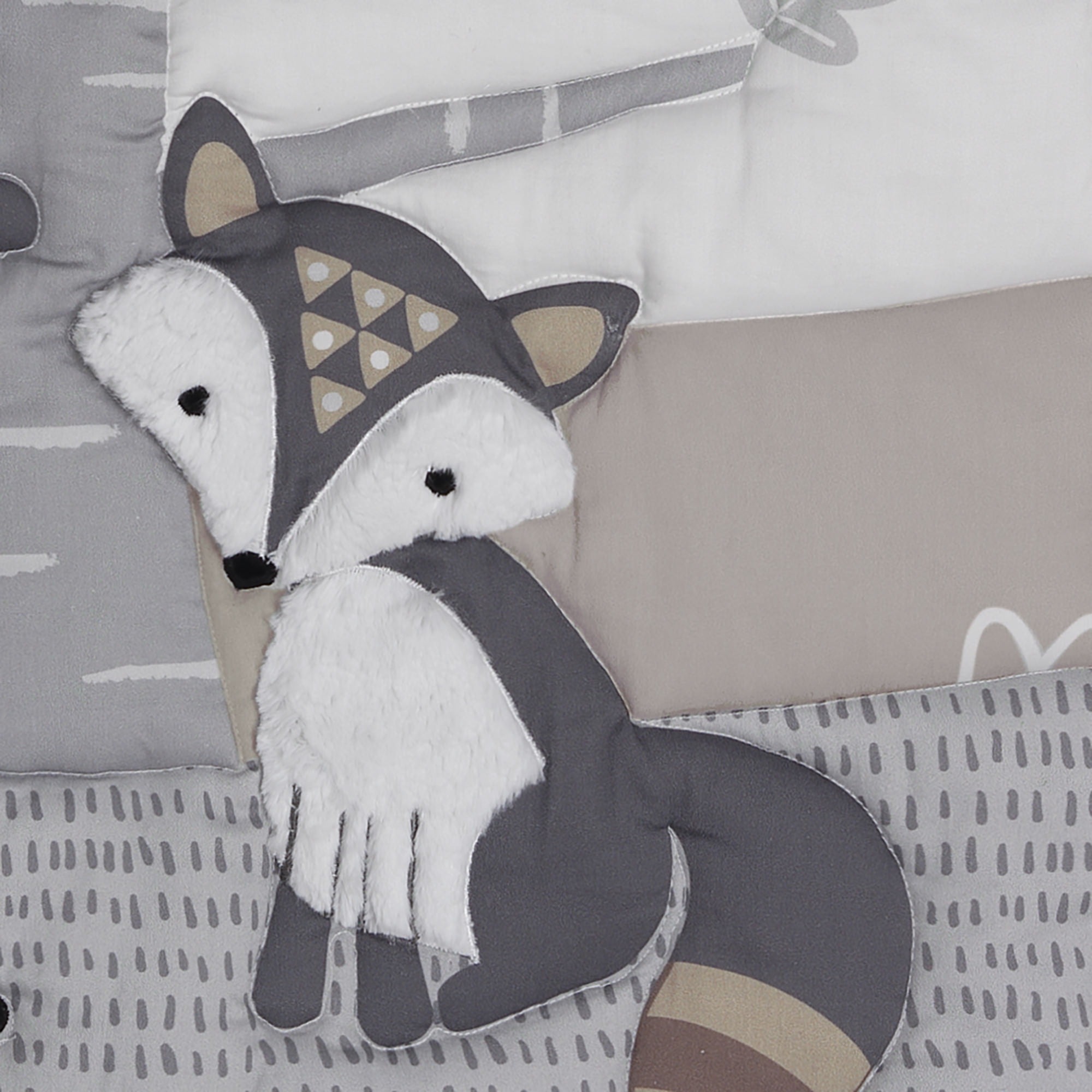$66.22Original price was: $66.22.$37.46Current price is: $37.46.The 3-piece bedding set includes one quilt, one fitted crib sheet, and one dust ruffle. An appliqued furry little fox enjoys the great outdoors underneath a gray tree with his favorite woodland friends. The fitted crib sheet features friendly foxes, cute raccoons, wise owls and trees. The dust ruffle is a trendy triangle print which is also the back of the quilt. Fabrications are a cotton poly blend exclusive of ornamentation. Imported.