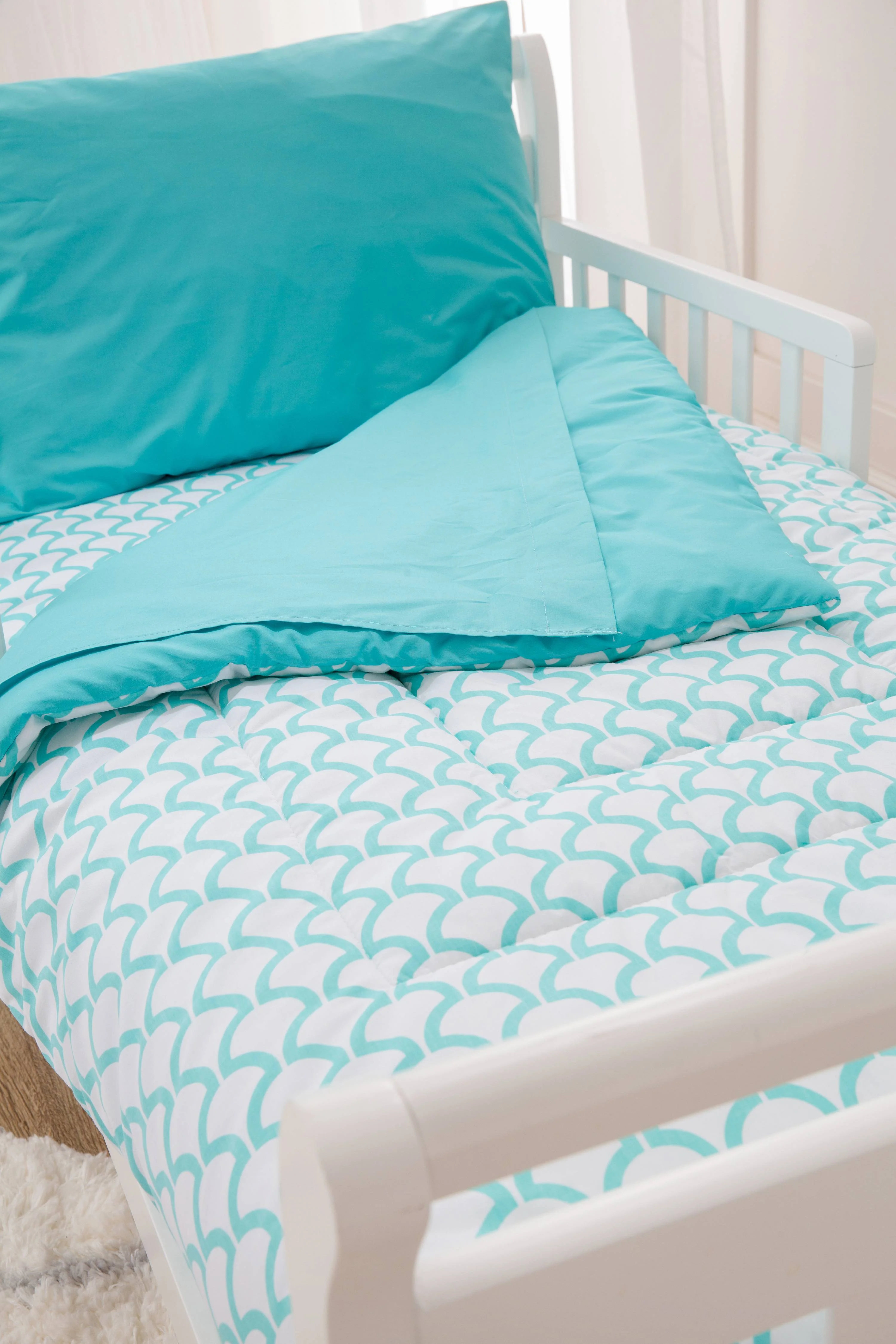 $31.53This American Baby Company 4-Piece Toddler Bedding Set is a soft and cozy way to decorate your child’s room. It fits standard crib mattresses and includes one comforter, one sheet fitted on one end with elastic, one bottom sheet and one pillow. This toddler crib bedding set is made from 100 percent cotton percale and is shown here in a lovely and calming Aqua Sea Wave pattern. It is also available in several other patterns and styles so that you can properly outfit and complement your child’s bedroom decor. This American Baby Company 4-Piece Toddler Bedding Set is machine washable to make for easy care and maintenance for busy parents.