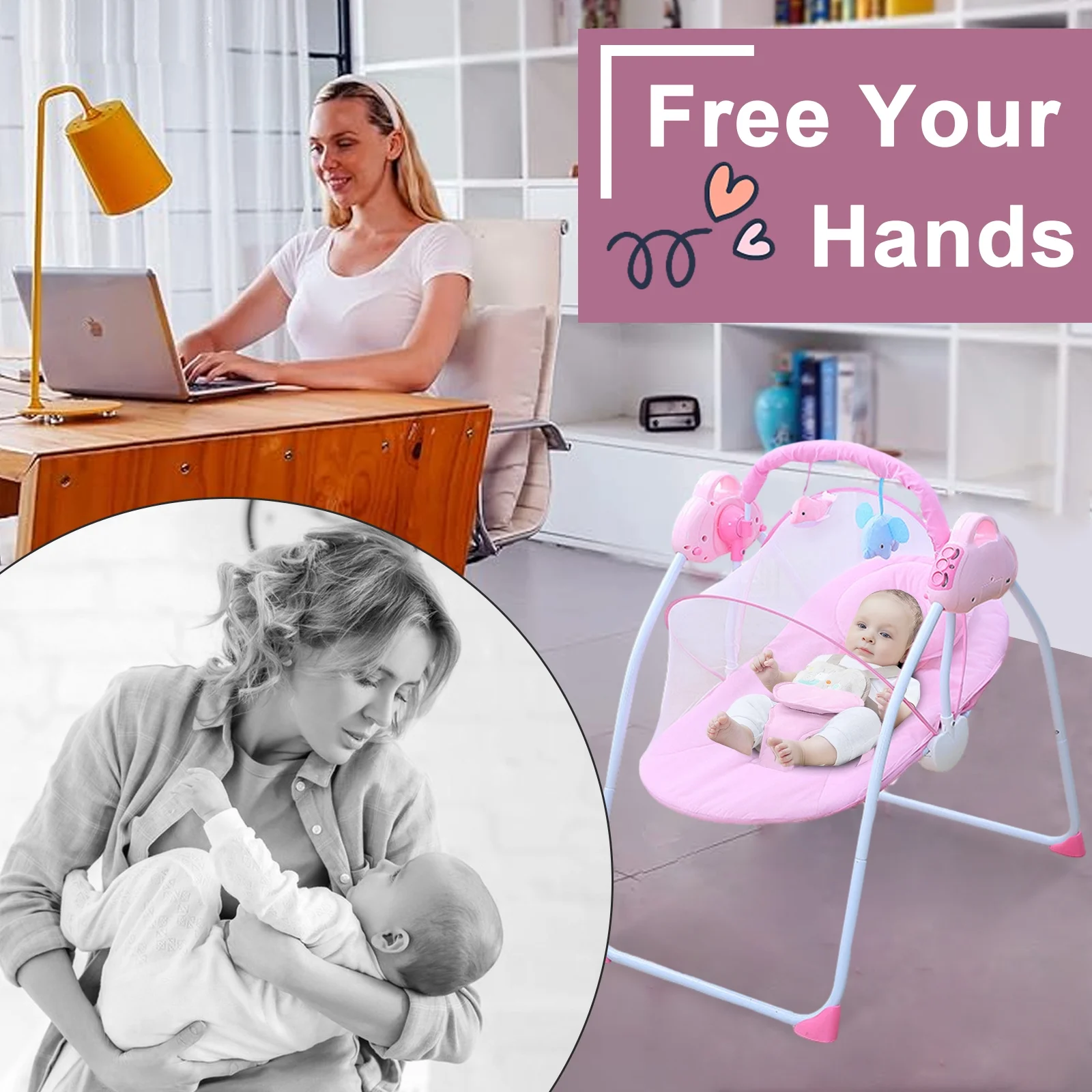 ANJORALA Baby Swings for Infants Toddler, Portable Newborn Swing Bouncer, Bluetooth(Pink)