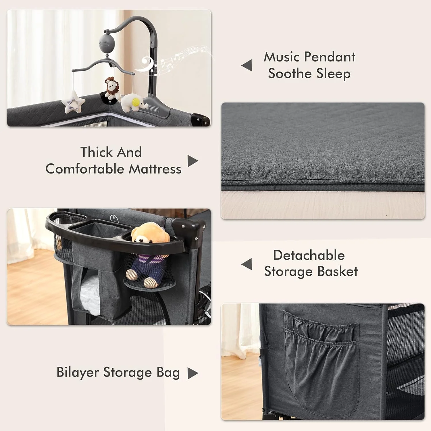 ANGELBLISS 5 in 1 Baby Bassinet Bedside Crib, Rocking Bassinet with Diaper Changer, Pack and Play with Bassinet, Portable Folding Playpen Playard with Mobile, Sheet & Mattress(Grey)