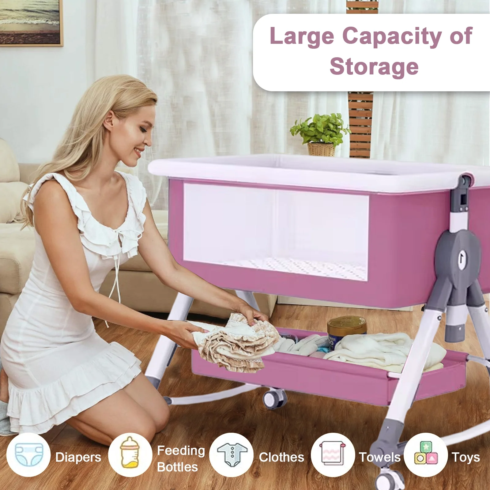$120.38ANGELBLISS bedside sleeper is made of thick aircraft aluminum frame, lightweight, safe and strong.100% polyester, high microfiber and skin-friendly quality fabrics, we always put children’s safety first. This pink bedside bassinet has four sides of breathable mesh, making it easier for parents to keep an eye on their children. Every child with delicate skin needs high quality supplies to take care of them.
