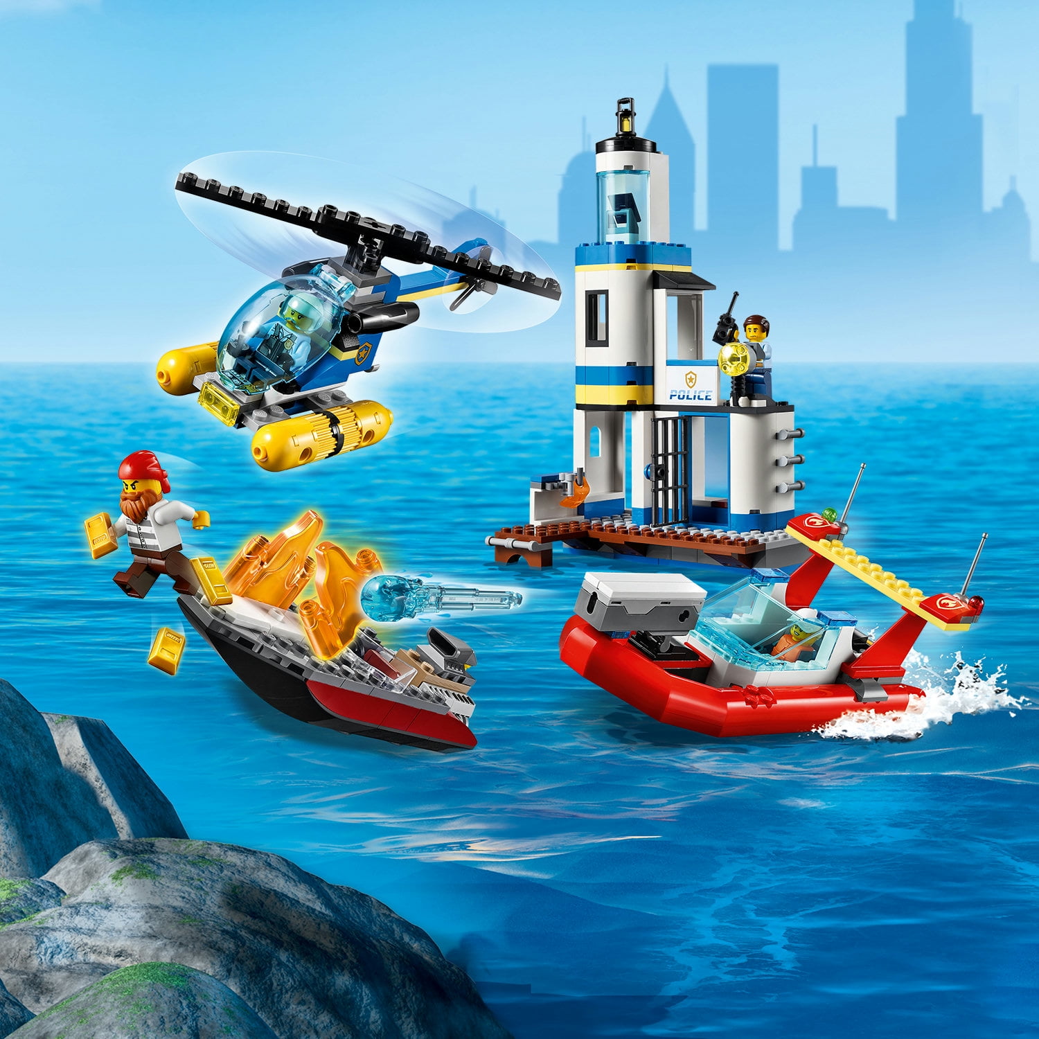 $51.14Delight an everyday hero with this exciting LEGO City Police and Fire Mission playset, packed with cool features for imaginative, action-packed play. The crooks getaway speedboat is in flames! Join LEGO City TV police hero Tom Bennett for fun police and fire adventures. Launch the fire dinghy and police sea helicopter. Use the dinghy’s extinguisher to knock out the flames and send in the police helicopter to make an emergency arrest. When the crooks safely onboard, transport him to the police cell for a long seaside vacation.
