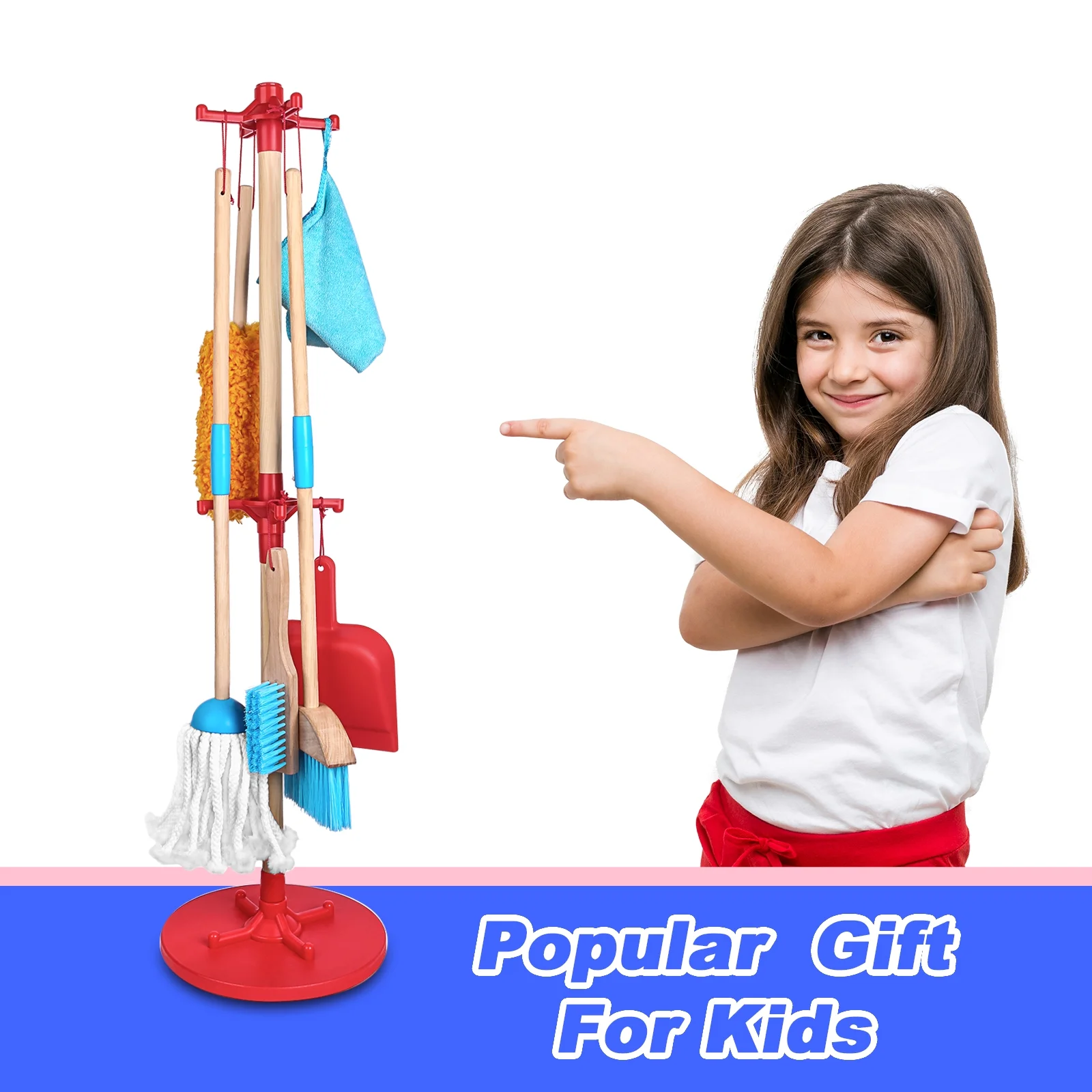 AOKESI 7 Piece Kids Cleaning Set, Wooden Detachable Cleaning Toys Includes Broom Dustpan Mop Brush Duster Rag and Hanging Stand, Pretend Play Housekeeping Tools Gift for Girls Boys, Blue