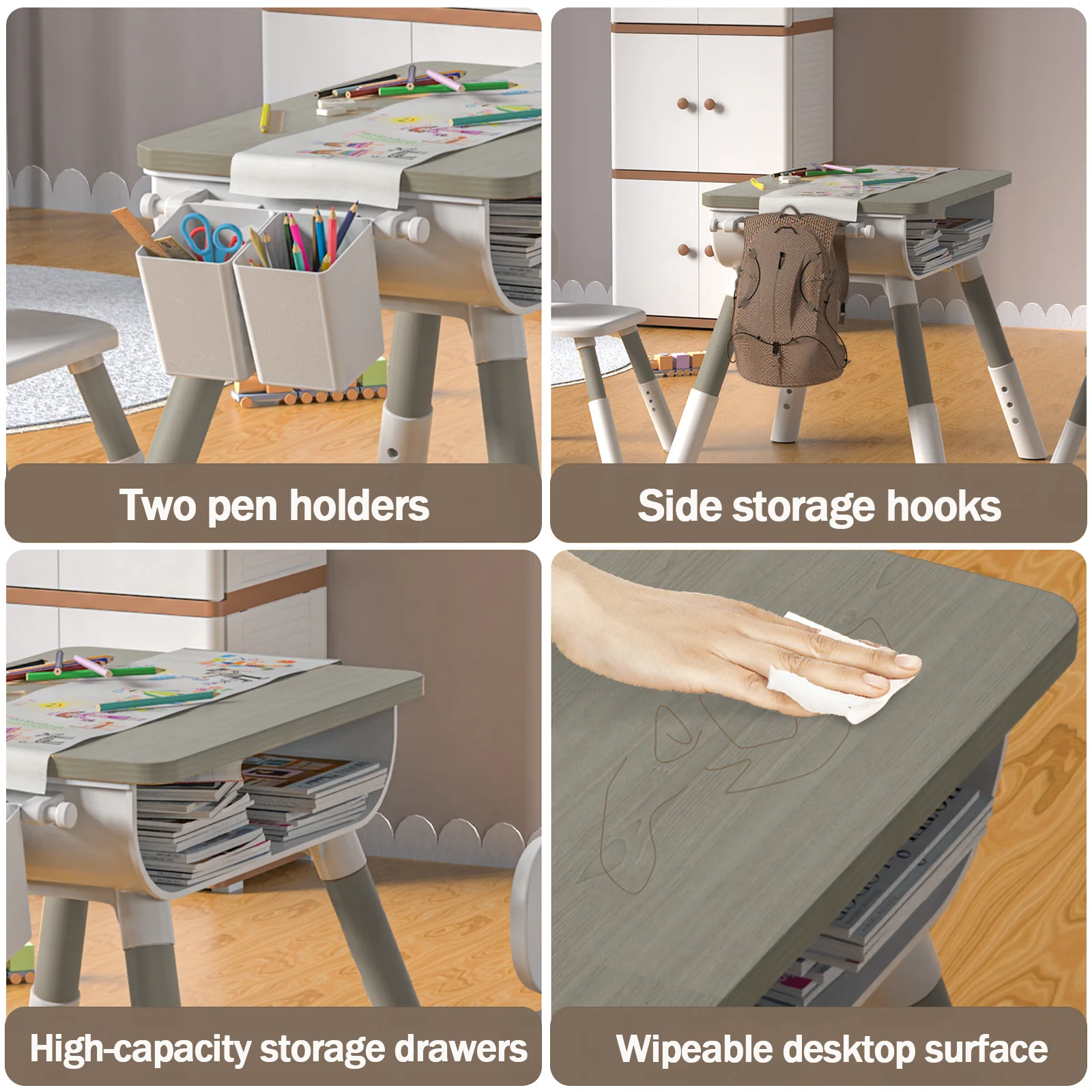 $85.99This is a well-designed toddler table and chairs designed to provide children with a comfortable, safe and fun environment. We pay attention to the quality and durability of the product, the table top is spacious and flat, easy to clean; the chair back is ergonomic and provides good support; the seat is equipped with an adjustable height function to meet the needs of children of different ages. ★ Function: two drawers and two storage boxes for organizing The overall size designed for children protects the spine and joints, and the ergonomic backrest provides maximum comfort Can be regarded as dining table, game table and small desk Can be used in homes, nurseries, amusement parks and kindergartens Perfect gift for children aged 2 to 8 ★ Accessories: table x1, chair x1, storage box x2 Applicable age: more than 12 months Material: wood + pp + glass fiber Assembled product dimensions (length x width x height): Table Size: 25.59×21.65 x21.65in Chair size: 13.38×12.99×19.29in Table weight: 5.5KG/12.12lb Chair weight: 2KG/4.4lb ★ Maintenance instructions: wipe with a damp cloth Note: This desktop can only be doodled with water-based pens!!! If you have any questions during installation or use, please contact us by email