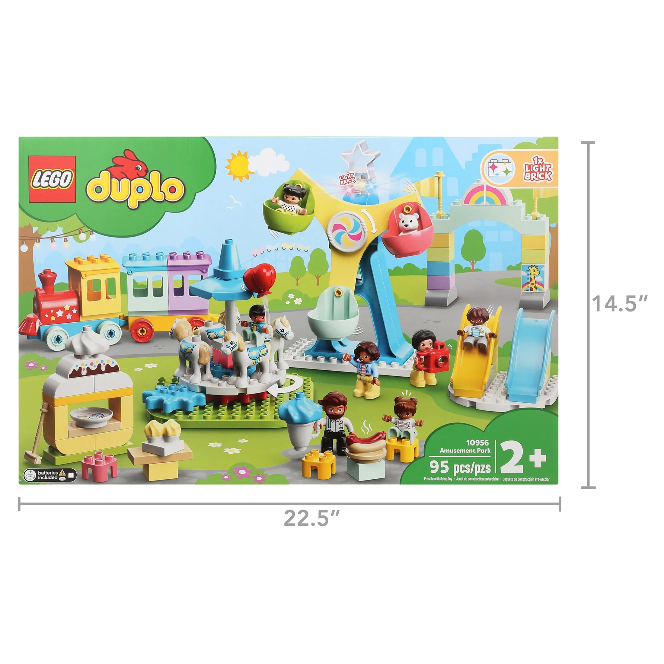 $85.96Join your toddler on an imaginative trip to the LEGO DUPLO Town Amusement Park (10956) fairground toy for toddlers 2+ years old and explore an amazing mix of attractions designed to engage, entertain and stimulate growing minds. Join 7 DUPLO characters – 2 women, 1 man and 4 children – for colorful, captivating developmental fun at the LEGO fairground! This multifaceted toy features slides to whizz down, a mechanical carousel to ride, a large Ferris wheel with 3 colorful cabins to operate, a LEGO DUPLO train to drive around the park, hot dogs to buy, plus toy ice cream, camera, balloons, cupcakes, broom and teddy bear. There’s even a color-changing ‘rainbow’ light to create an authentic funfair atmosphere. LEGO DUPLO educational toys for toddlers put open-ended fun, self-expression and joyful learning into preschoolers’ hands. With DUPLO playsets, parents and young children can share precious developmental milestones as they build together. Measures over 11 in. (28 cm) high, 48 in. (123 cm) wide and 11 in. (28 cm) deep. Contains 95 pieces.