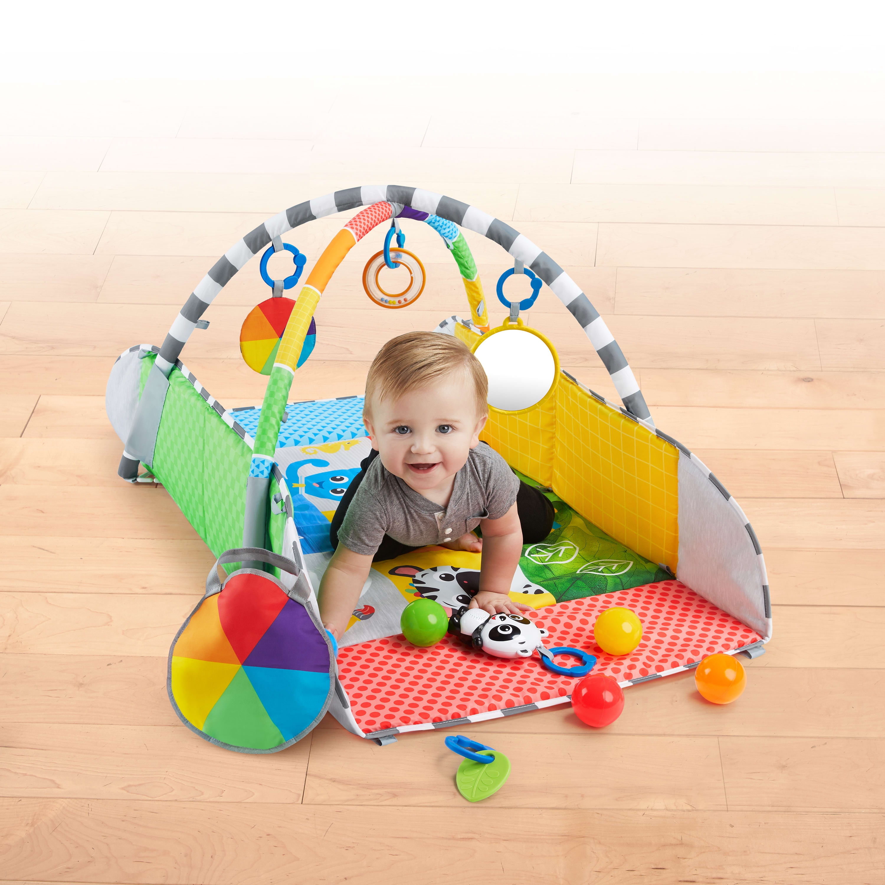 $47.66This is the space where early exposure to art and music happens. Its plain to see Patchs 5-in-1 Color Playspace Activity Gym & Ball Pit from Baby Einstein features bright colors. But why? Because even at 3 months old, babies struggle to see dull or pastel colors, but bright colors are completely captivating! To help baby discover the primary and secondary colors on the color wheel, you can say the name of each out loud. This play gym will grow with your little one from those earliest tummy-time workouts to babys favorite ways to help develop their motor skills: ball pit activities. The high-contrast panda toy plays more than 20 minutes of melodies, perfect background tunes for play sessions. Whether babys on the mat or on the go, theyll love interacting with the 5 included take-along toysfrom an infant-safe mirror to the visually-stimulating ring rattle. The collection of 10 colorful balls comes in handy because the activity mat transforms into a ball pit when all the walls are up. Even handier (for parents, at least) is the color wheel bag for easy storage of the balls. A removable prop pillow provides support for baby during tummy time. For quick cleanup, simply remove the toy bars, and toss the play mat into the washing machine. Makes a great gift for aspiring artists, newborn and up.
