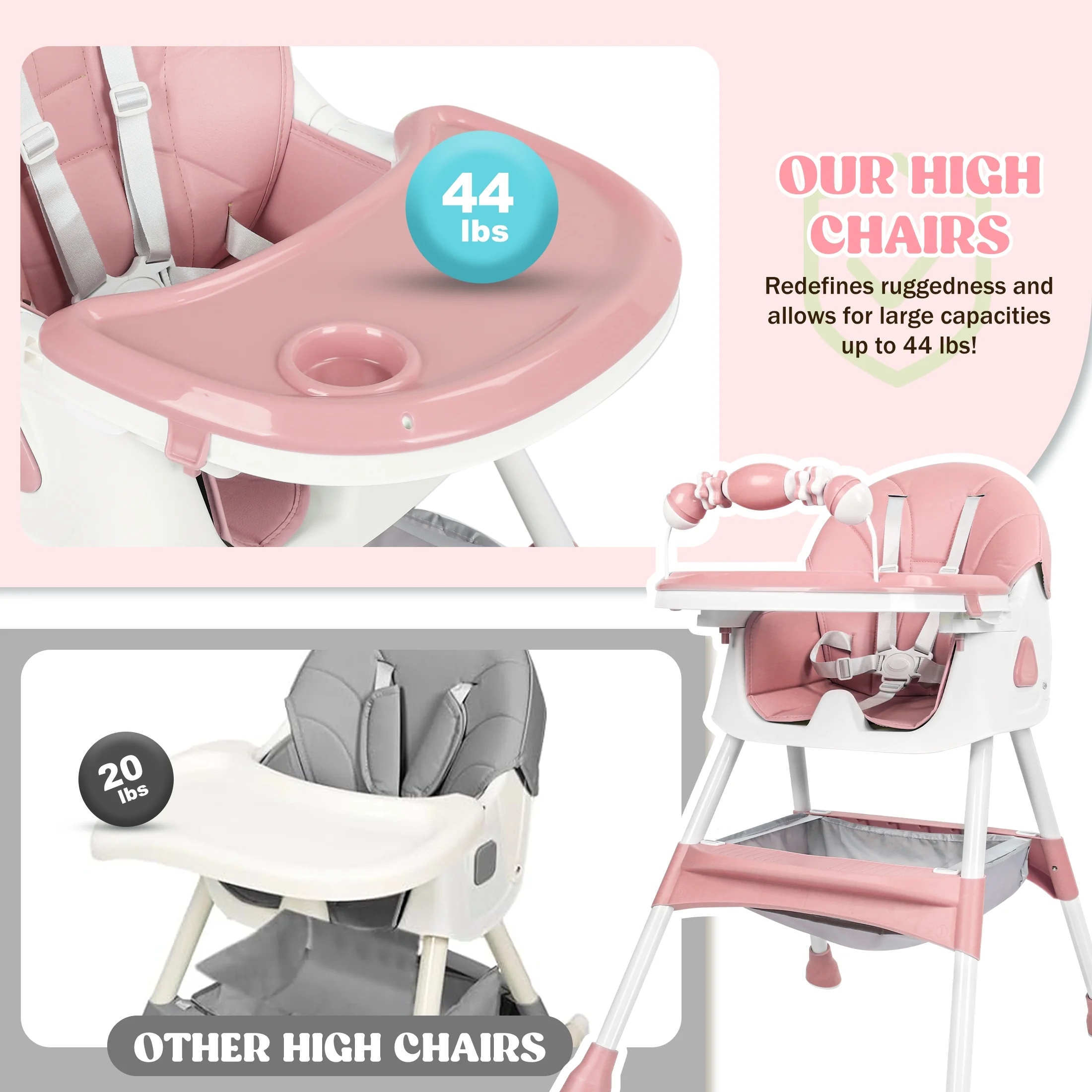$138.97Original price was: $138.97.$85.99Current price is: $85.99.This versatile 4-in-1 high chair feature solid value and smart design, adapt effortlessly to your child’s needs with its functions as a baby high chair, toddler arm chair, baby dining chair, and baby rocking chair. Suitable for ages 6 months to 6 years, which could ensure long-lasting use. It breeze with a removable and telescopic tray, a five-point safety harness, a anti-slip seat crotch and 3-level adjustable backrest to ensure baby maximum comfort and safety. In addition, the high chair for toddlers has 4 removable 360 degree lockable wheels and a large storage basket, which can hold baby toys or other baby’s essentials while taking kids for a walk. The baby booster chair can be effortlessly folded away with a single click to storage out of sight or to pack easily into the car, ideals for home and traveling! Product Specifications: Material: Plastic PP, PU leather pad, Steel pipe Weight: 11.5 Pounds Product Dimensions: 24.8 x 29.53 x 35.83 inches Color: Pink/Blue/Grown Care instructions Wipe the stain with a damp cloths Assembly requie: Yes Age range: 6 Months & Up Max Weight: 60 lbs Package Includes: 1 x Convertible Baby Chair Reminder: Be sure to use your product as directed. If not sure how to assemble and use properly, just contact our world-class, friendly customer service team for quick solutions.