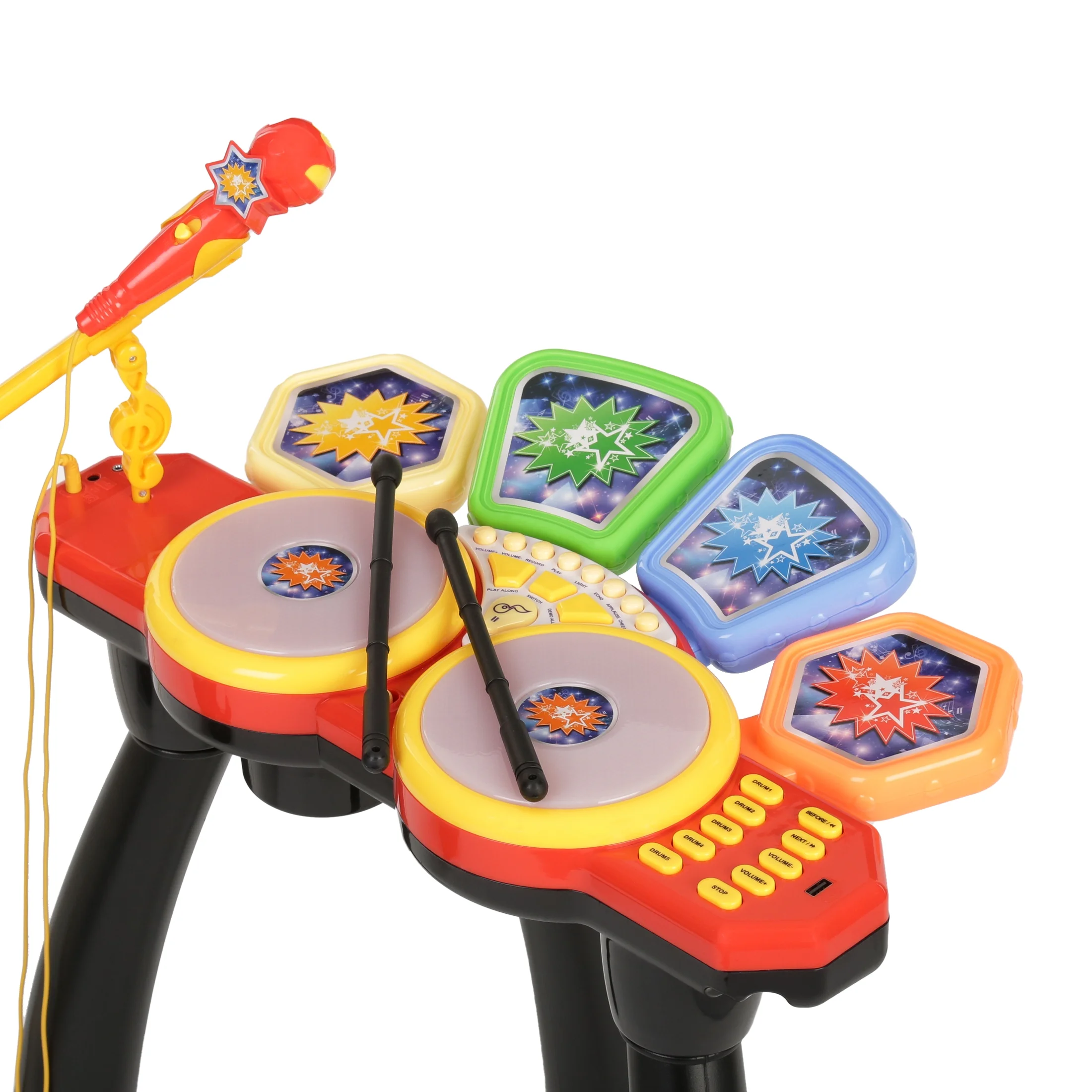 $40.41Little ones will be inspired by the pre-loaded demo songs to create their masterpieces. The large speaker and Big Bass sound make all the music sound great. They can have fun creating different sounds using the different preset rhythms or rehearse and put on performances. They can also connect an MP3 Player or Flash Drive to the USB port and jam to their favorite tunes. This kids’ electronic drum set is color coded and includes buttons such as tempo controls for controlling the speed of the music and volume controls. Included are two drumsticks, a microphone, a stand, and a stool. It is quick and easy to put together. Some adult assembly is required. Recommended for ages 3 years and up. Warning: choking hazard – small parts. Not for children under 3 years.
