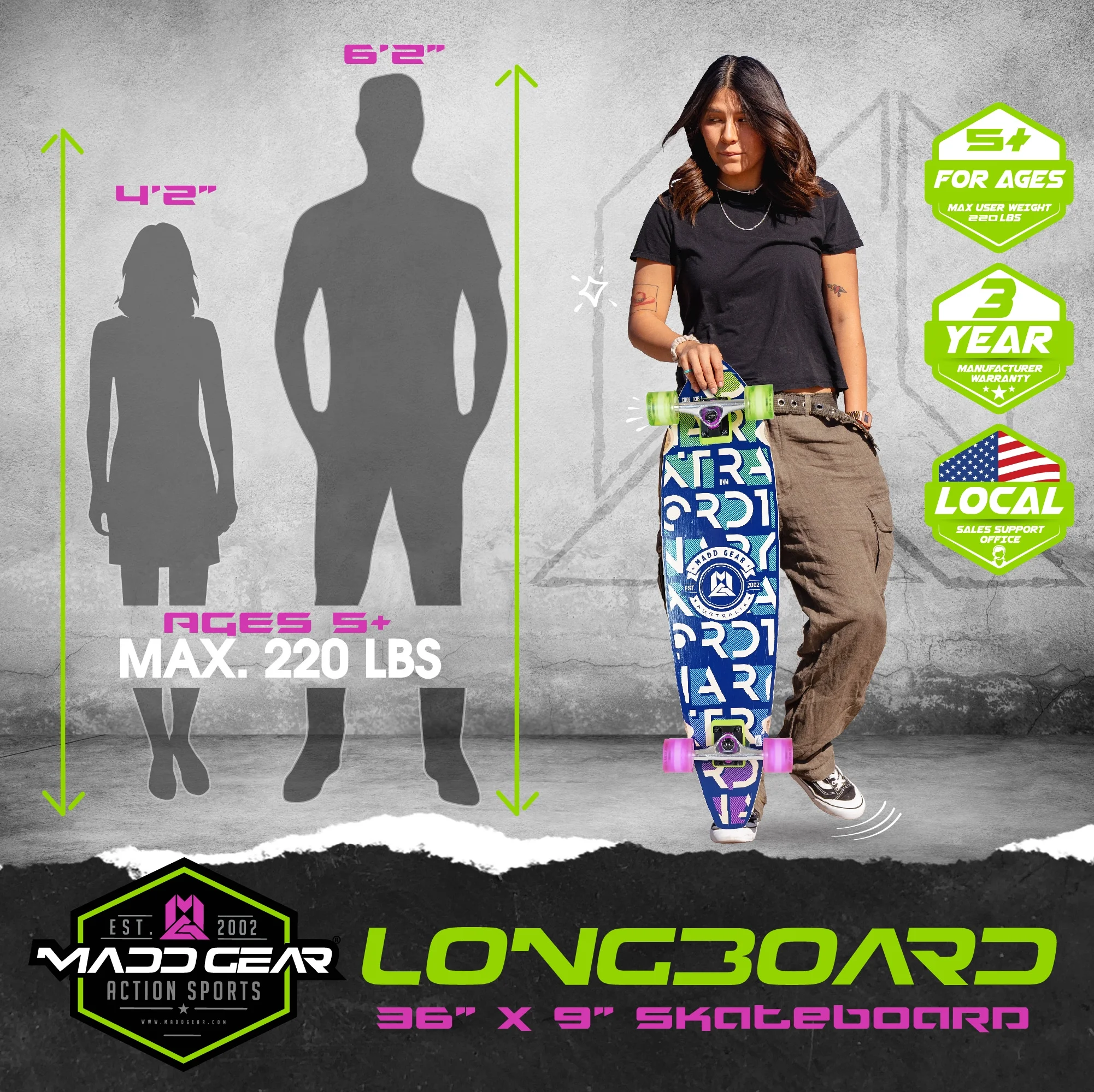 Madd Gear 36″ Pintail Longboard Skateboard – 62mm Wheels, ABEC-9 Bearings, Maple Deck for Cruising & Carving