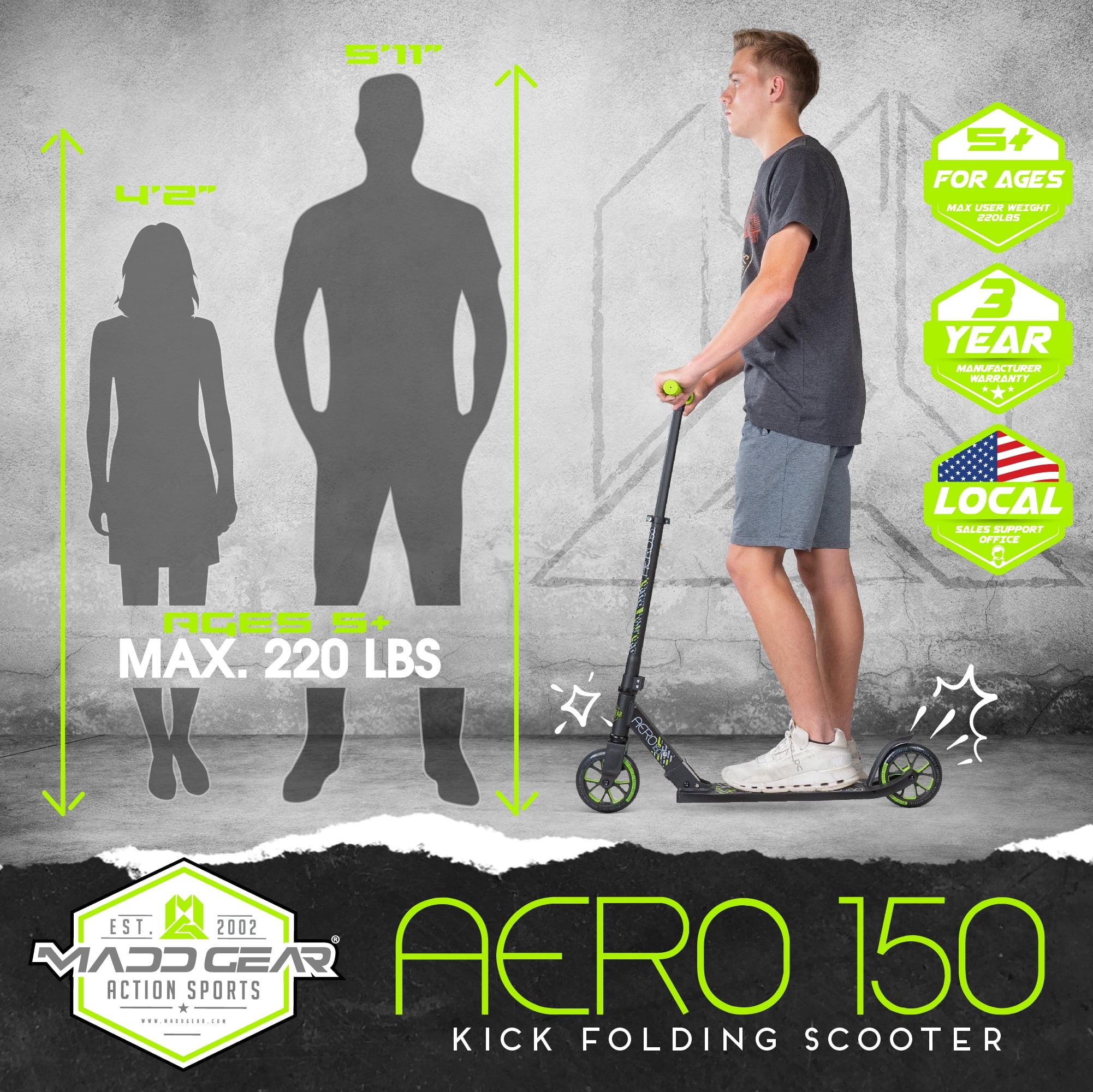 $41.28The Madd Gear Aero 150 Kick Folding Scooter is an amazing cruiser or school commuter! Fitting in between the Madd Gear Flow 100 and the Kruzer 200, the Aero 150 scooter hits that sweet spot between small kids scooters and larger commuter scooters. The Madd Gear Aero 150 Kids Scooter is ideal for kids and teens 4’2″ right up to around 5’11” with a maximum user weight of 220lbs or 100 kg. Featuring our quick-release easy-fold locking mechanism, the Aero 150 scooter can easily be carried or stored under the bed, trunk of the car or desk at school. Recommended for riders 5 years and Up