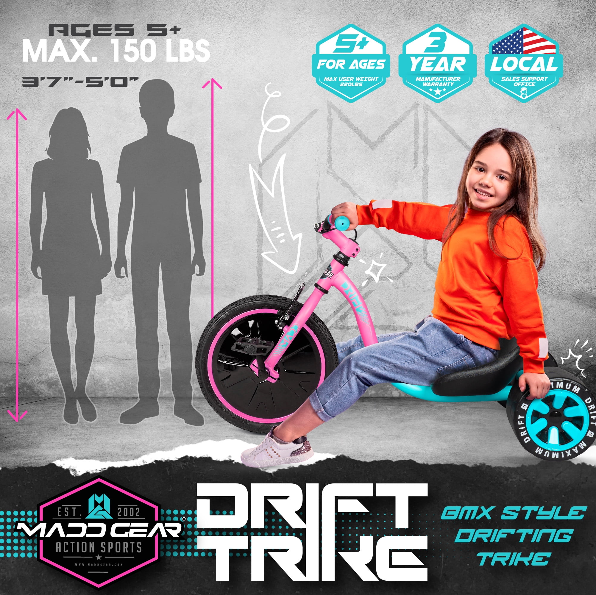 Madd Gear Drift Trike Strong Steel Frame Tricycle Adjustable Seat Pink for 5 Years & up