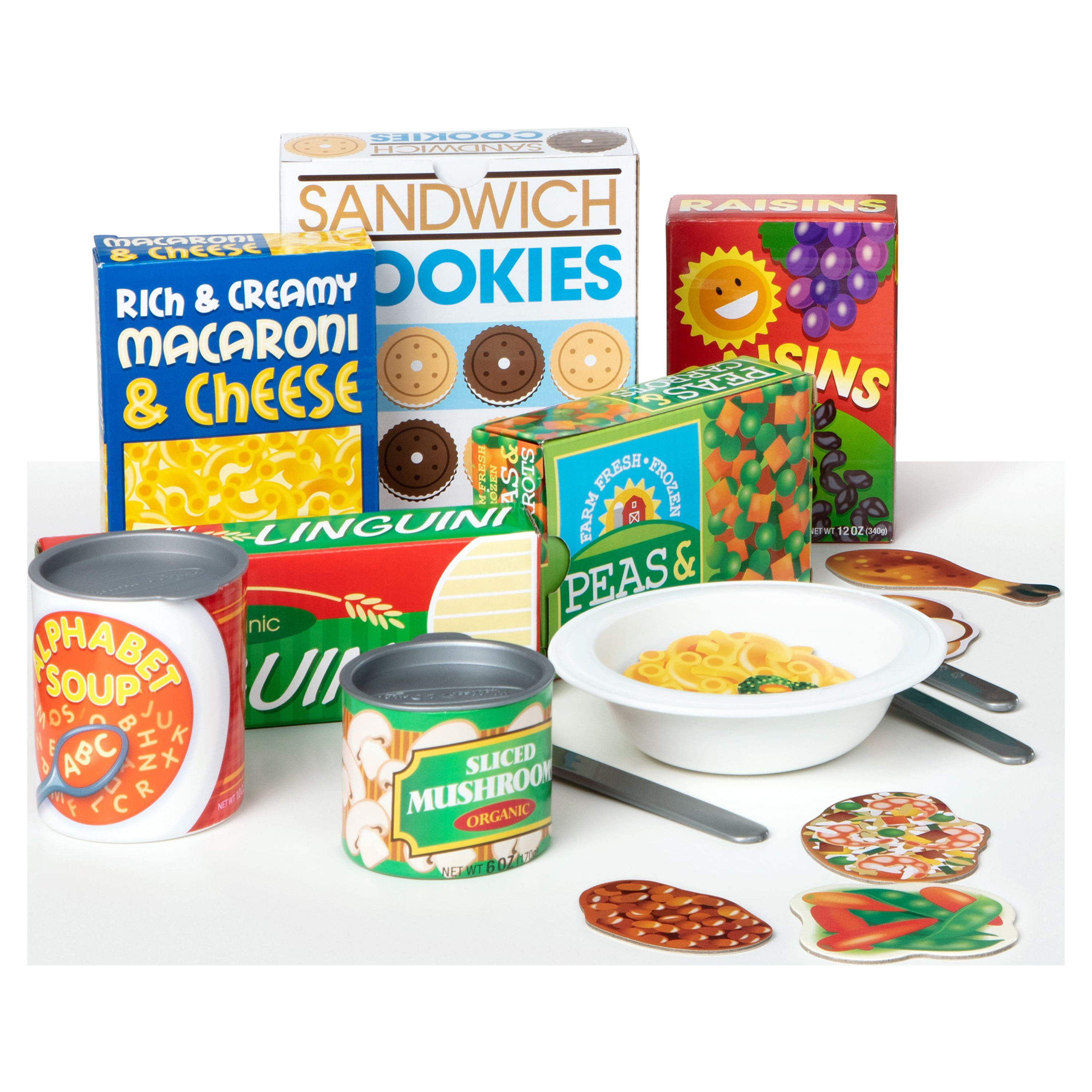 $85.99Satisfy the hungry imaginations of kids three and older with this all-inclusive collection of durable pretend play serving utensils, dishes, and cookware, double-sided play food pieces, and realistic grocery boxes and cans! Dozens of double-sided play food pieces and drink inserts show either cooked and uncooked or different food options to combine to make countless make-believe meals! Stock play kitchens, restaurants, and grocery stores with pretend play food boxes and cans. Cook with durable pot, skillet, colander, and serving utensils on the stovetop and sink play mat, then serve using the included durable place setting. Round out the play experience with a sturdy grocery tote and reusable activity cards!