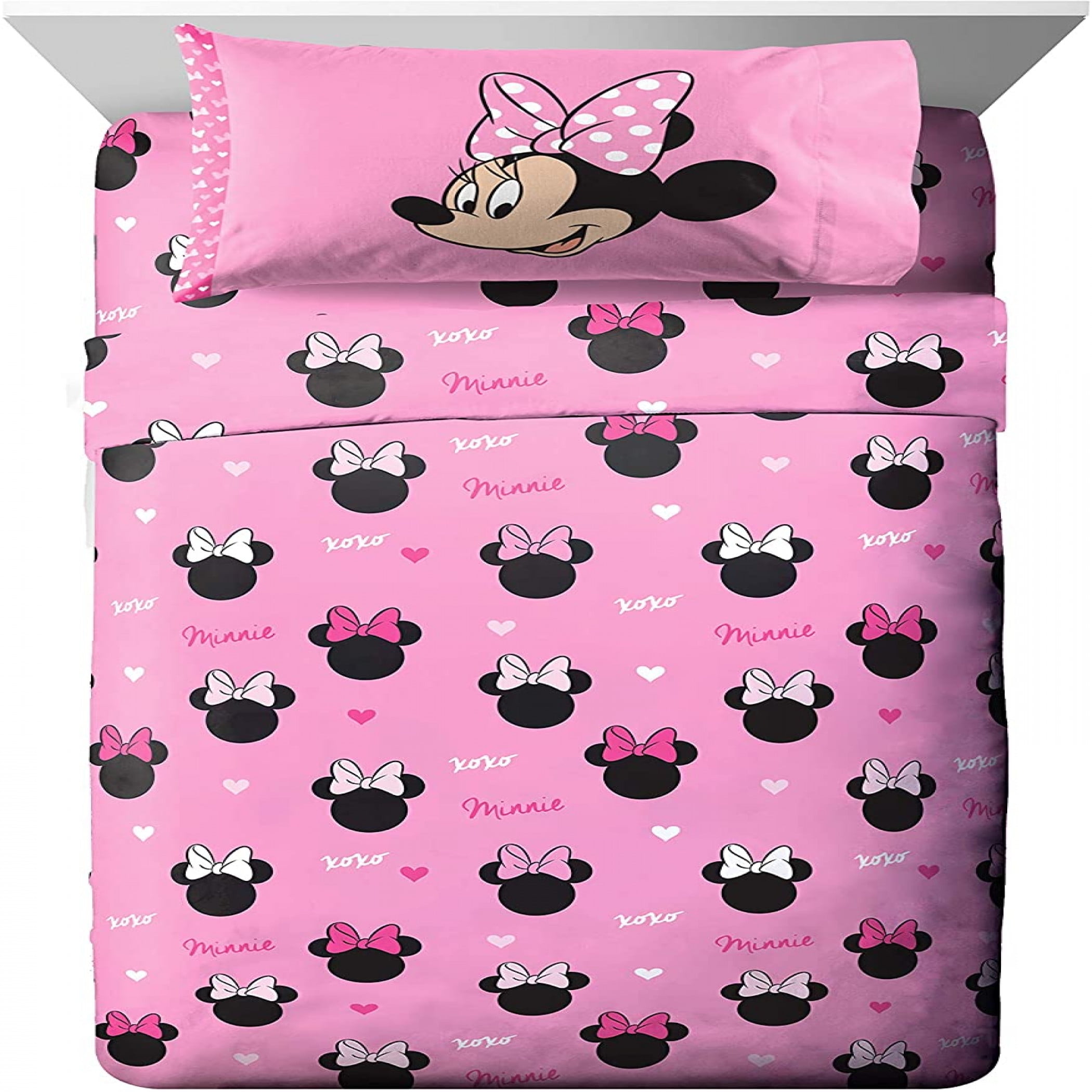 $54.17Officially licensed Disney Minnie Mouse Character All Over Reversible 4-Piece Twin Bed Set. This cute Minnie Mouse twin bed set includes (1) 64-inch x 86 inch twin Comforter, (1) fitted sheet 39-inch x 75 inches, (1) flat sheet 66-inch x 96 inches, and (1) standard pillow case 20-inch x 30 inches. Made from 100 percent brushed microfiber polyester. Fade-resistant and machine washable. To clean, the machine washes cold. To dry, air/tumble dry on low.
