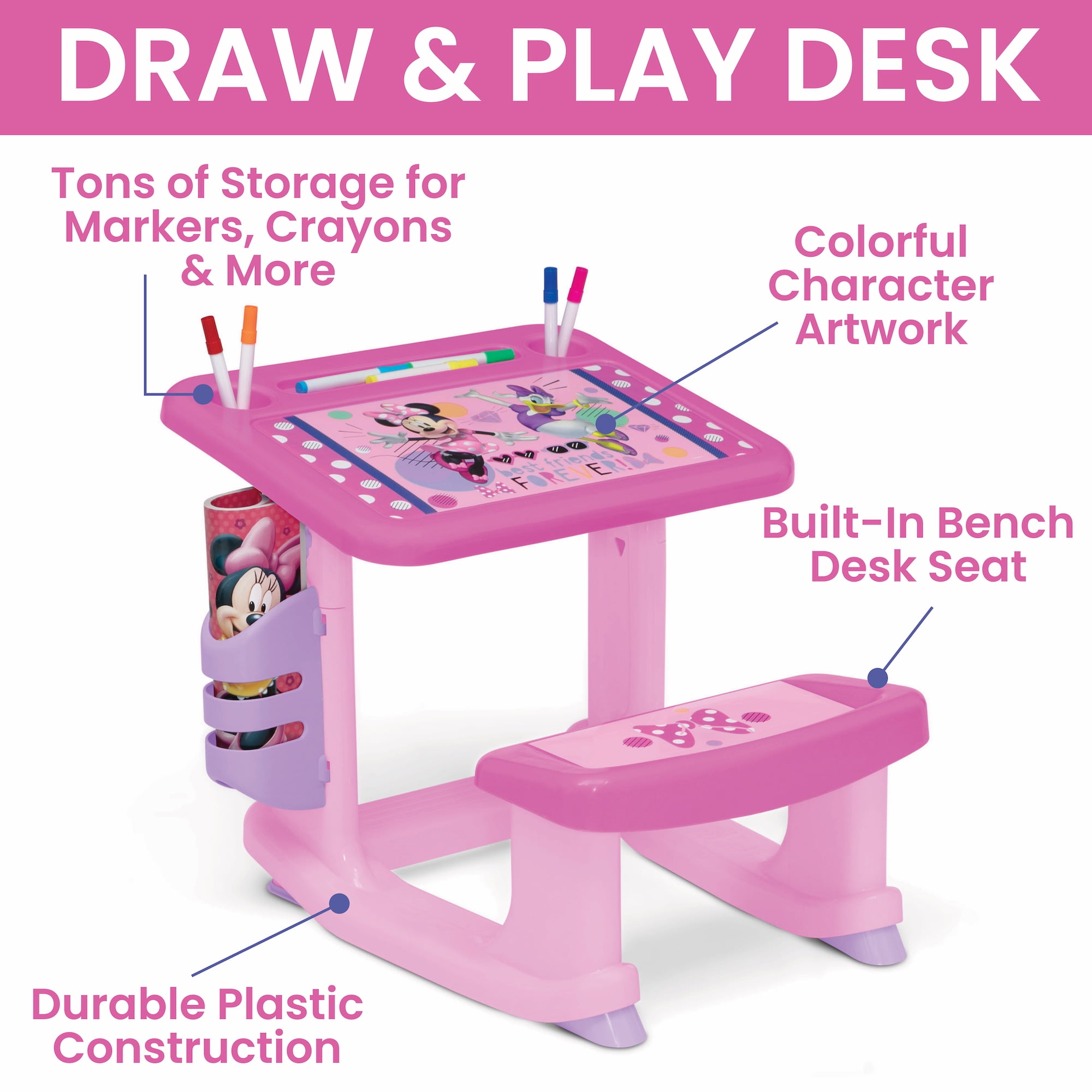 $42.14Cater to your little one’s creative side with this Minnie Mouse 3-Piece Art & Play Toddler Room-in-a-Box by Delta Children! A versatile set covered in lovable Minnie Mouse graphics makes it easy for kids to draw, paint, play and learn, while at the same time develop imagination, creativity and hands-on ability. This all-in-one art and play solution includes a Draw & Play Desk, Art & Storage Station and Fabric Toy Box. The Draw & Play Desk is a colorful spot to paint or draw. This sturdy art desk with bold character graphics helps inspire creative play. Tons of storage space for the markers and coloring books makes tidying up easy. The desk’s built-in bench seat and footrest ensure your little one stays comfy while they play. The Art & Storage Station is the perfect piece for your budding artist. It features a fabric storage bin on the bottom, shelf to hold books or toys, and four plastic cup holders to store markers, paint brushes, crayons and more. The sides of the Art & Storage Station are made with a whiteboard material that can be used with the included reusable vinyl cling stickers or dry-erase markers (markers not included). The Fabric Toy Box pops up, ready to be filled whenever needed with toys big and small, then easily collapses when not in use. Get the Minnie Mouse 3-Piece Art & Play Toddler Room-in-a-Box by Delta Children today, it makes the perfect holiday or birthday gift!