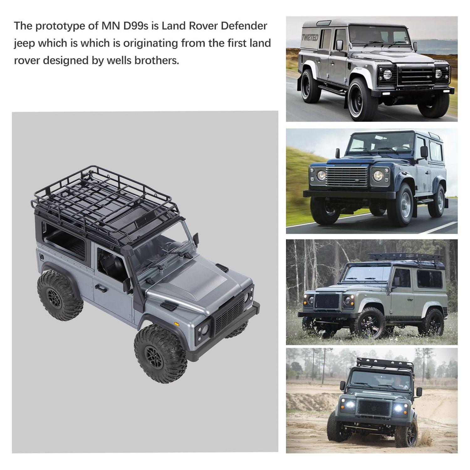 $100.61MN 99s 2.4G 1/12 4WD RTR Crawler RC Car is a big scale truck with a huge body, a high simulation appearance of the real car Land Rover D90. Features: * All-round simulation control, forward/backward, left/right turn. * 2.4Ghz -interference control frequency supports multi-car competition. Full-scale steering gear, proportional control. * Simulated rubber tires with stronger grip and friction resistance. Upgraded Alloy, -wear and -fall. Simulation lighting. DIY accessories replacement, high playability. * 7.4V large capacity lithium battery, strong power, long-lasting battery life. * Any problem, please contact without hesitation. Honor to serve you! Specifications: Brand: MN Model: MN 99s Item name: RC Car Main material: ABS + Metal Color: Silver gray Motor: Brushed Speed: 8.72km/h Frequency: 2.4G Control distance: About 80m Battery of remote controller: 4* 1.5V AA batteries (not included) Car battery: 7.4V 1300mAh Charging time: About 180min Working time: About 15min Item size: 34*15.5*19cm Item weight: 915g (including battery) Age: ≥14 Note: * There could be some deviations due to manual measurement or slight color difference owing to photographing condition. Thank you for your understanding. * Don’t over-charge, or over-discharge batteries. Don’t put it beside the high temperature condition. Don’t throw it into fire. Don’t throw it into water. Package Information: Package size: 42.5*26.5*17cm Package weight: 1521g Gift box package Package List: 1* RC Car 1* Remote Controller 1* Battery for Car 1* USB Charging Cable 1* Instruction Manual