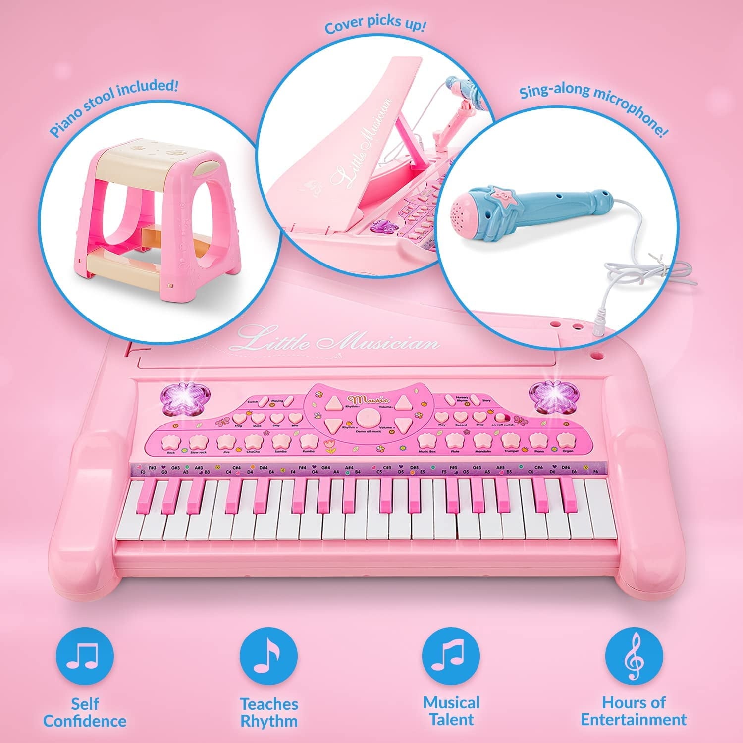 $42.99All In One Piano Set: Our kids keyboard piano comes with everything your little one needs to sing, play, learn and have fun including a 37 key electronic piano, microphone, and a piano stool! We also include an audio cable to connect MP3 players to play your toddler’s favorite tunes Multi-Function Use: This mini toddler piano for girls lets your little one choose from 4 animal sounds, 8 tones, 19 sound effects, Music Demos, Nursery Rhymes, and so much more to keep them engaged and entertained for hours while encouraging them to learn more about music Safe And Endlessly Fun: With eye-catching light effects and sturdy ABS build, this musical piano keyboard for kids helps promote Hand-Eye Coordination, Tone Recognition, Independent Thinking, EQ Cultivation, Creative Thinking, and more! It’s made without relying on any BPA or harsh materials Simple And Adjustable: You can easily adjust the volume and rhythm of the electric piano keyboard to provide just the right fit. It’s battery-powered and features a mic holder so your little one can play and sing at the same time while sitting comfortably on the stool Educational Gift For Kids: This musical piano for kids ages 3-8 makes a thoughtful and fun gift for girls on any occasion to welcome them to the world of music. It makes the perfect gift for Birthdays, Christmas, New Year’s, Thanksgiving, Easter, and any other occasion