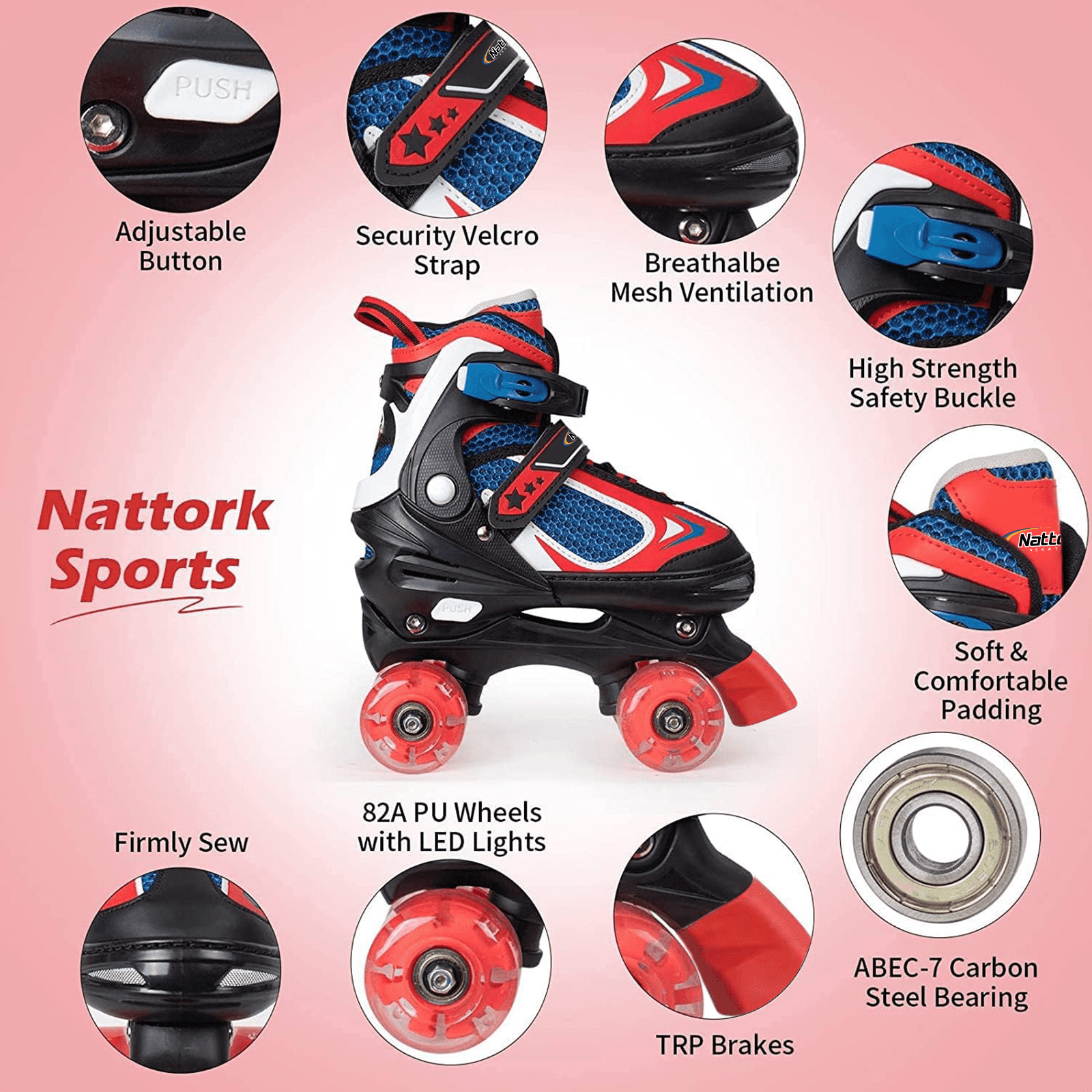 Nattork Roller Skates for Boys Girls Kids 4 Sizes Adjustable Quad Skates with Illuminating Wheels Red Size S