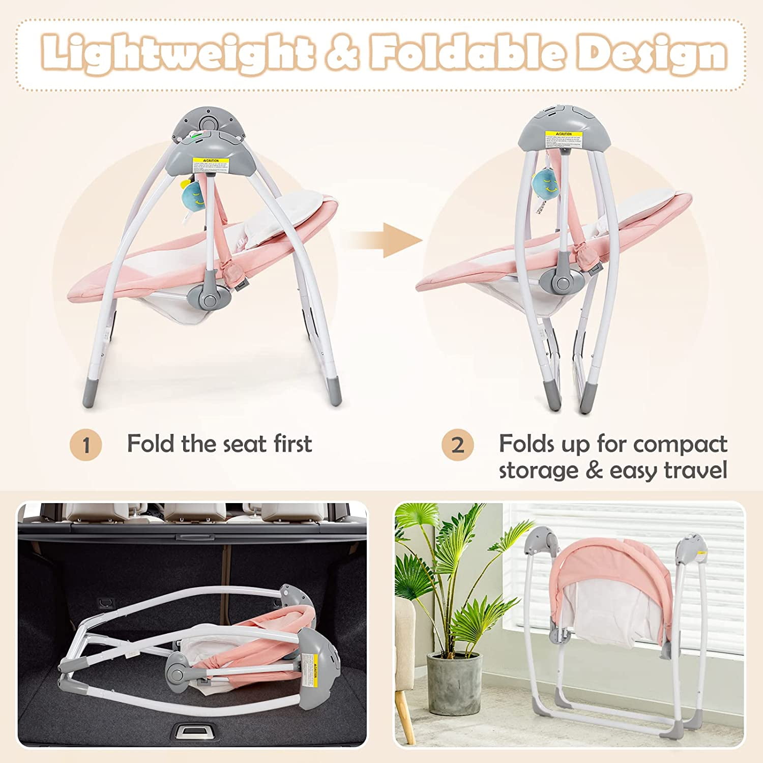 OLAKIDS Baby Swing for Infants, Compact Portable Baby Electric Rocker Chair for Newborn with 5 Speed Natural Sway Music Timing 2 Toys Remote Control, 0-6 Months Boy Girl (Pink)