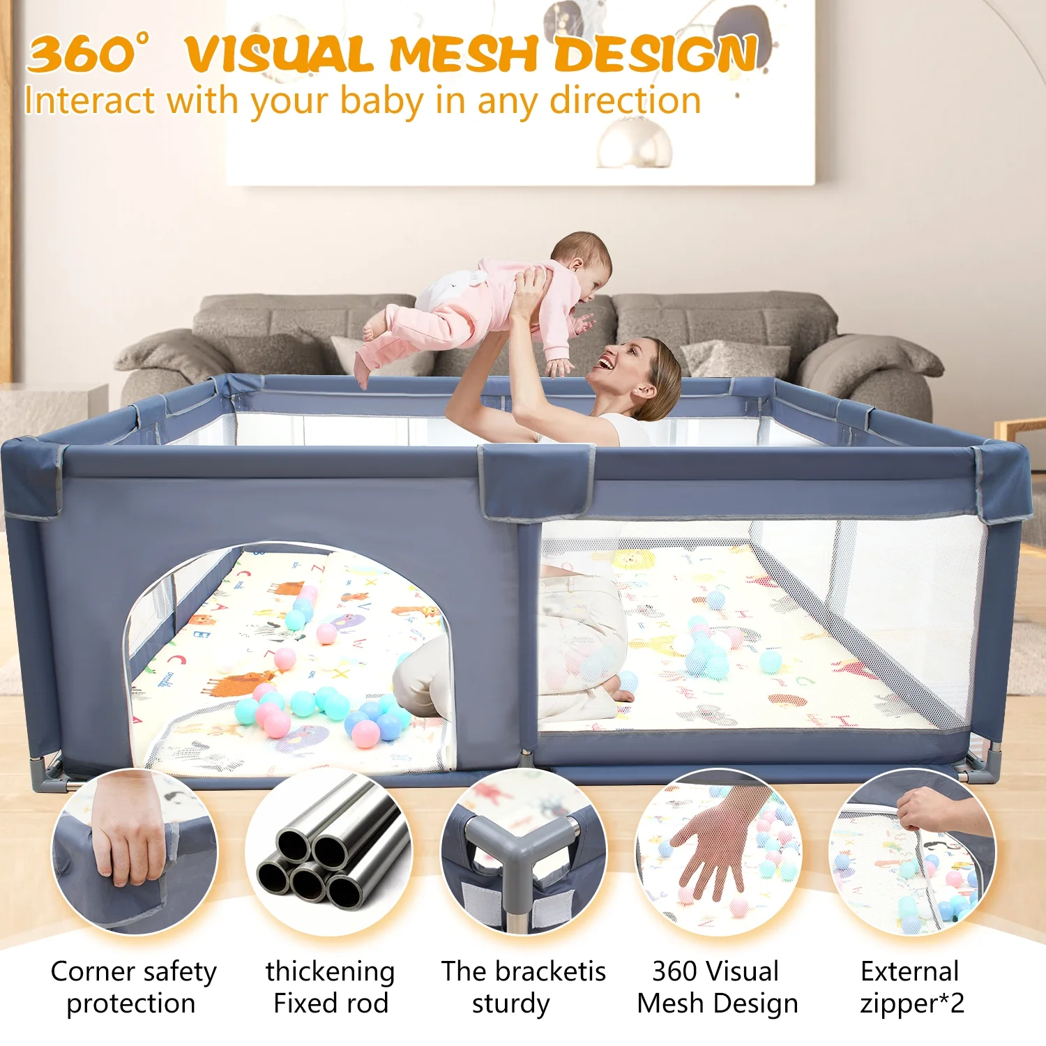 $71.37Baby Playpen with Mat Included: The size of the Extra Large Play Yard for toddlers is 71″x 59″x 26.5″ so that both dad and mommy play with a baby inside. wide scientific height and airy mesh sides provide great views for you and your baby. Your little one will love his new crawling area. Sunnycome baby gate playpen is an essential tool :provides a safe and engaging environment for children throughout their growth journey, offering both fun and educational experiences. Simplify family’s life: It can be challenging to constantly monitor your baby when mon have numerous tasks to attend to. Luckily, the portable outdoor baby playpen provides a secure and convenient space for your child, both at home and while traveling. Specificification: Pattern Type: Solid Color: Blue Ages: For 1-5 years old Material: Oxford cloth Steel pipe Size:71″x 59″x 26.5″ Features: 360°Foldable, Portable,Safety Package Included: 1x Playpen Features: Made of fabrics, it is stable and durable. With breathable mesh, it is easy to install and disassemble. Ability development, thinking, and practice, intellectual development, crawling, interest cultivation, hand-eye coordination, parent-child communication, interactive toys, and other abilities training.