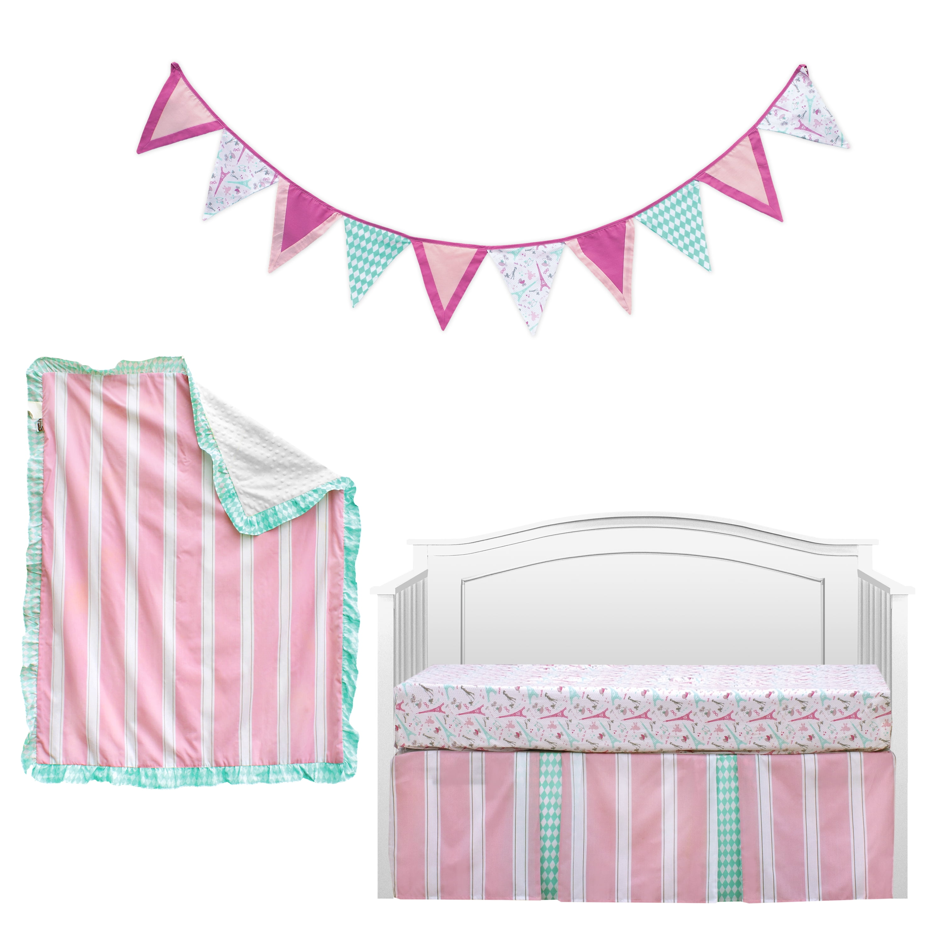 $63.64Original price was: $63.64.$52.43Current price is: $52.43.All these poodles will have your baby girl saying “Oh, La La” in her chic nursery with our Simply Posh Crib Bedding Set. The 4-Piece Crib is made of cotton and polyester for a cozy and comfortable slumber. This set includes: baby blanket, decorative bunting, pleated bed skirt and one fitted sheet. Mix and match with other pieces in Pam Grace Posh in Paris Collection to create the nursery of your little one’s dreams. Baby Bedding Set Includes: Pink, Gray and Aqua Baby Blanket Crib Skirt Fitted Paris Crib Sheet Wall Bunting ( Decoration)