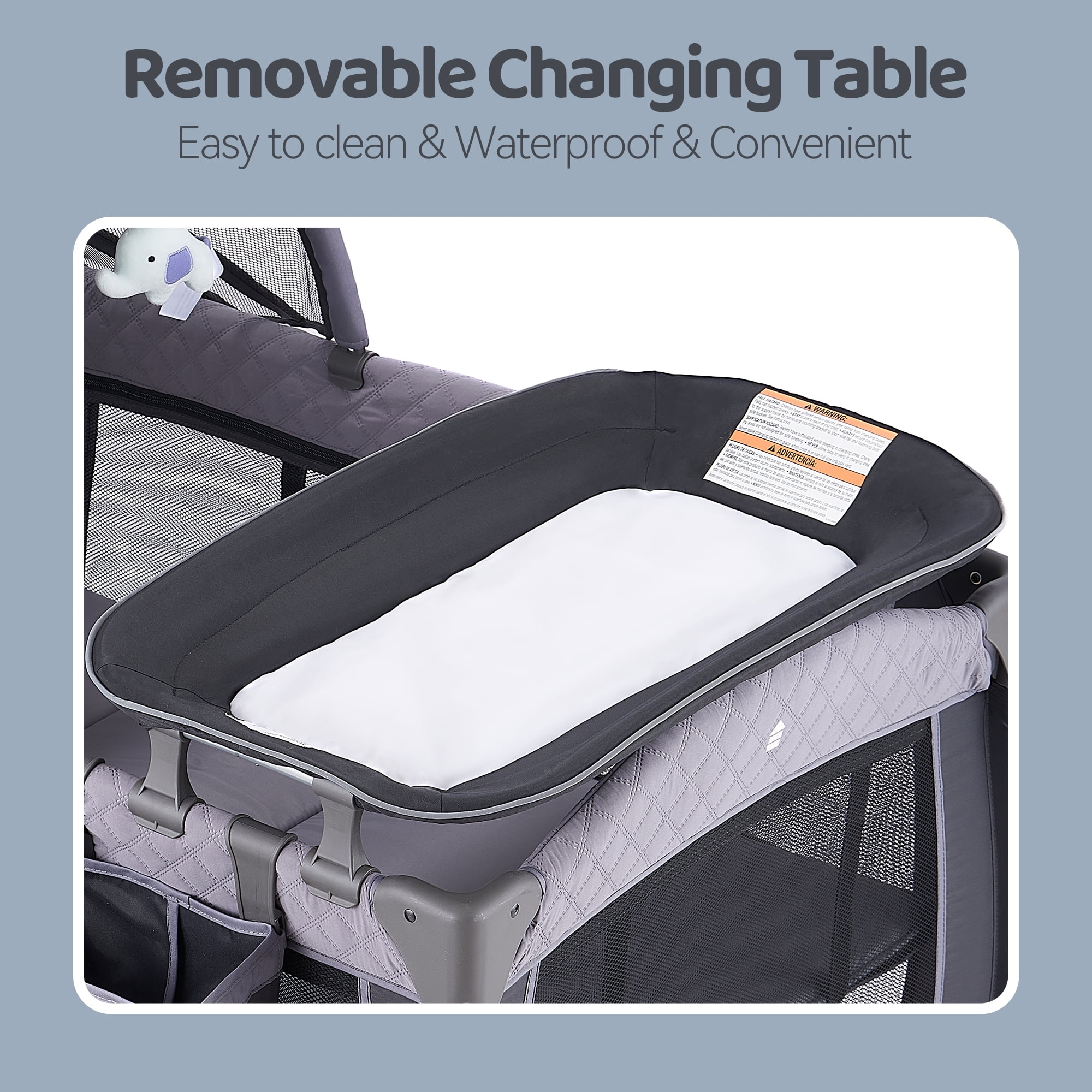 $171.99Original price was: $171.99.$137.59Current price is: $137.59.About this playard The 4-Panels playard includes a removable full bassinet, sleep nest, changing table. Easy locking mechanism makes the playard stable and it can be moved from place to place with large wheels and secured with brakes. Also included is a convenient travel tote bag. The Newborn Unisex 4-Panels Playpen with an incline less than or equal to 7° from horizontal while in using. What’ s in the box: Playard Assembly X1 Baby Bassinet X1 Mattress for Playard X1 Changing Table X1 Sleep Nest Frame X1 Diaper Organizer X1 Carry Bag X1 Toys Bar X1 Toys X3