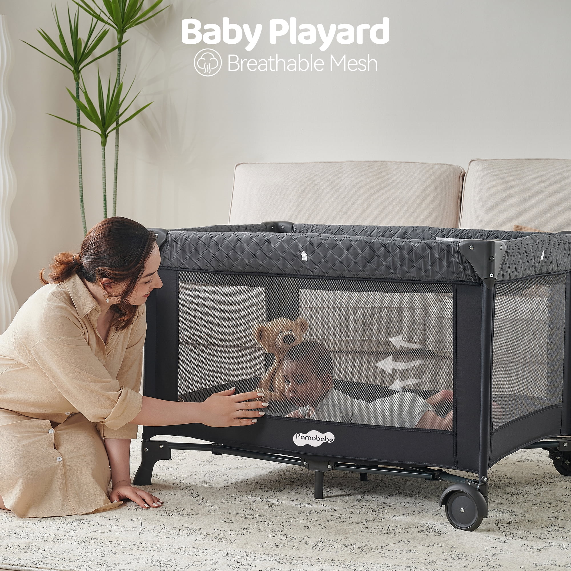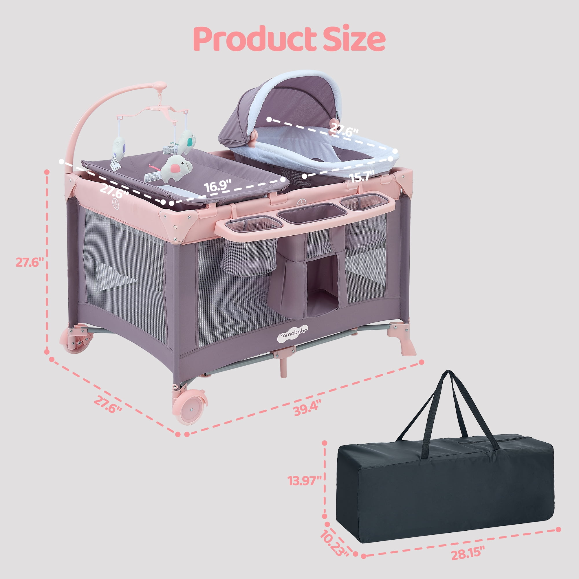 $67.07About Pamo Babe Pamo Babe is a 16-year professional manufacturing enterprise specializing in baby crib design, research and development. Our approach to caregiving systems from a heritage of innovation designed around safety, durability and the best intentions of loving parents. The Pamo Babe portable playard will provide you convenient and pragmatic place for baby playing! The Unisex Infant playard has 360-degree visibility mesh and zipper-controlled entry and exit. Easy locking mechanism makes the playard stable Also included is a convenient travel tote bag. Specification: Folded Size: 8.66*8.66*24.43nches Net Weight: 7.8 kg/17.2 lbs Gross Weight: 8.2 kg/18.1 lbs Applicable age(age group): 6-36 months Applicable weight: Up to 33lbs Mattress Size: 37.4*23in Fold Size: 8.66*8.66*24.43in
