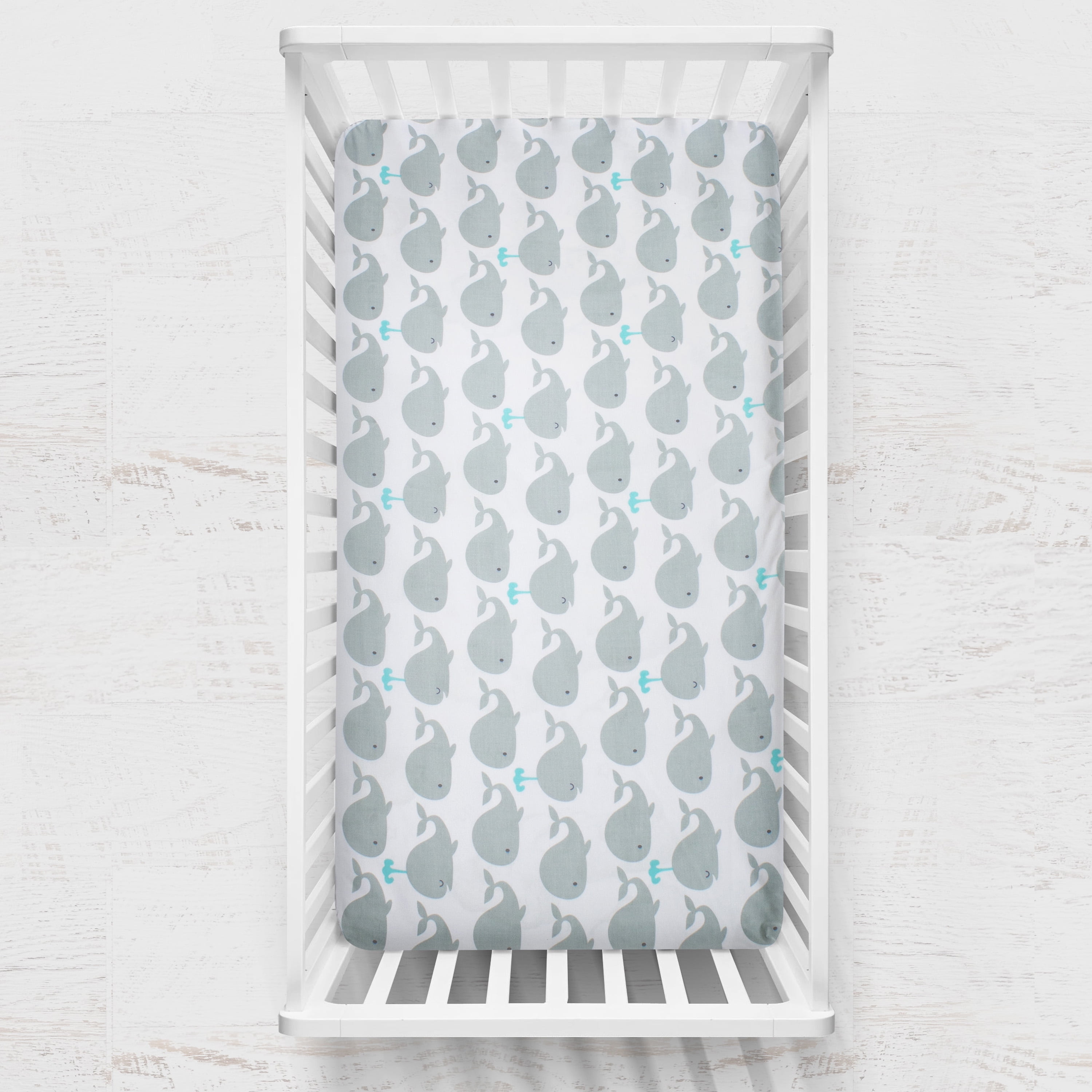 $52.59Our Nautical Whale 3 Piece Crib Bedding Set is sure to make a big splash in your nautical themed nursery. Friendly, tranquil whales in smooth grey on a soft white background welcome your baby to naptime. Our 3-pc Whale Crib Bedding set comes with Reversible Chenille Dot Blanket, Fitted Crib Sheet and Pleated Crib Skirt. All Pam Grace Creations Bedding Sets are made with reversible, coordinating pieces for an easy and fun update of your nursery. Constructed with a soft, comfortable cotton/poly blend, our sets freshen up quickly with a simple machine wash and dry. Other matching items available to complete your Nautical Whale Nursery set include Reversible Chenille Dot Blanket, Boppy Cover, Changing Pad Cover and Lamp Shade.