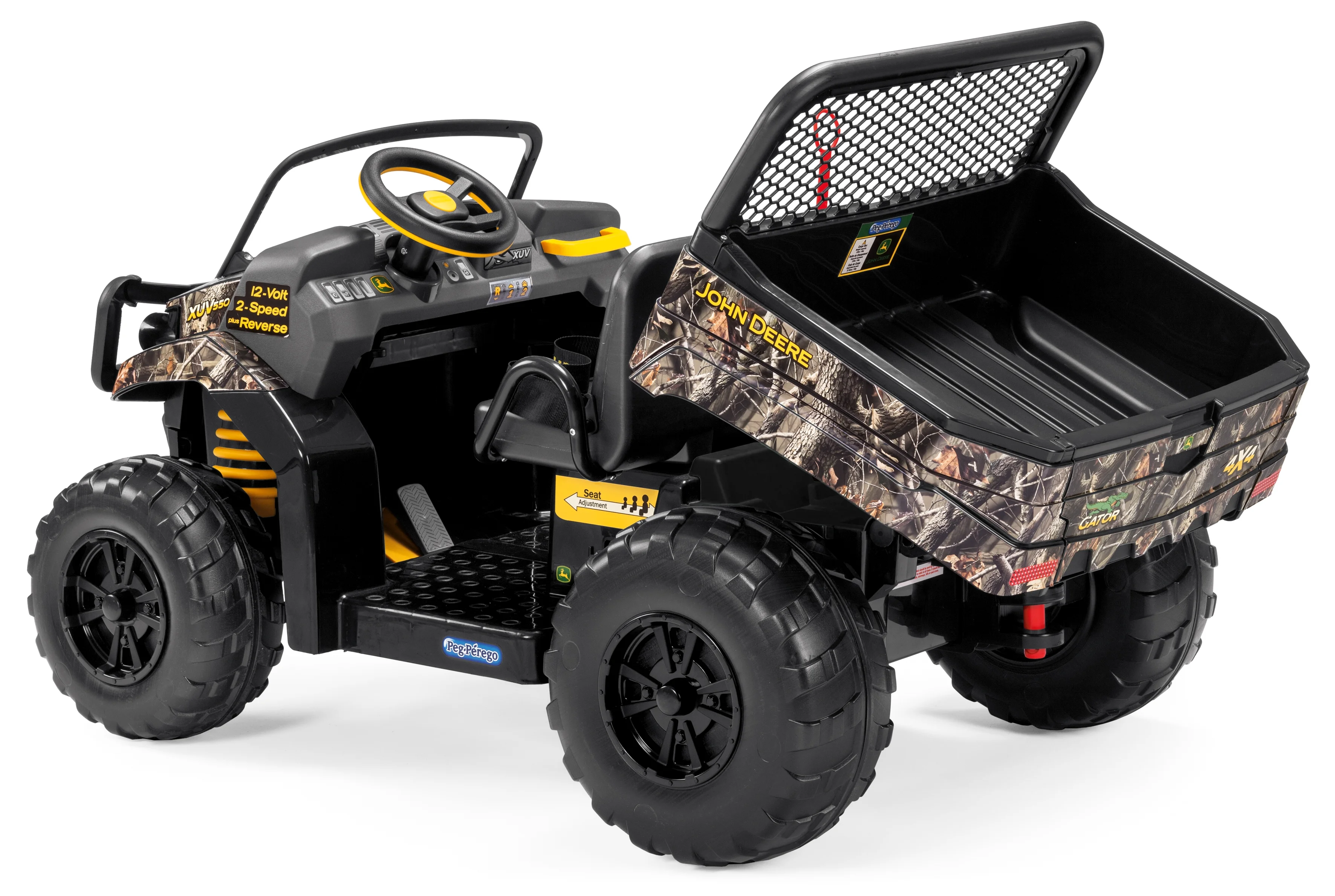 $369.79Outfitted in authentic REALTREE Camo, the John Deere Gator XUV Camo will turn heads, while letting your little one haul everything imaginable in their large dump bed with opening tailgate. The 2-speed shifter with reverse allows them to drive 2.25 or 4.5 mph on grass, dirt or hard surfaces. Parents will appreciate the adjustable seats with seat belts and second speed lockout that prevents beginners from going too fast. Includes a 12 volt rechargeable battery and recharger. Made in our Fort Wayne, Indiana factory using domestic and global components.