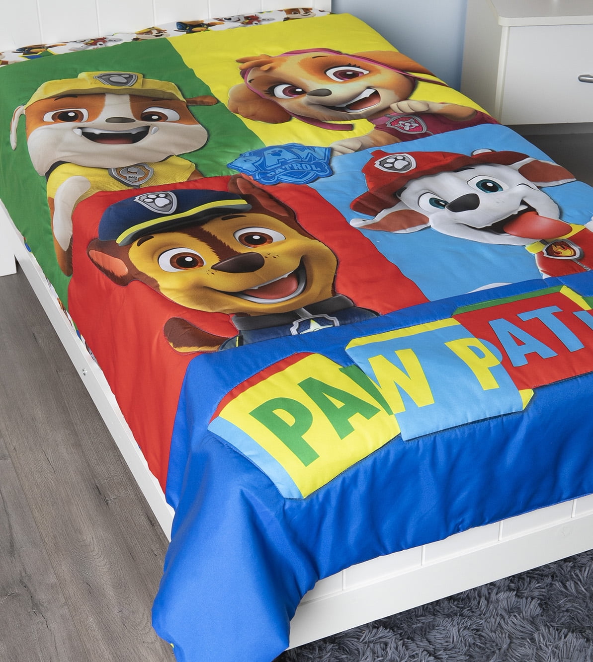 $42.95Make your little one’s bedtime “Paw-Some” with this colorful and cozy Paw Patrol Top Pups 5-piece toddler bedding and blanket bundle set. Featuring the beloved pup heroes, Chase, Marshall, Skye and Rubble. This bright and playful 5-piece set includes a reversible bedspread, flat sheet, fitted sheet, reversible standard size pillowcase, and cozy plush blanket. Fits a standard crib/toddler mattress. The comforter and pillowcase is reversible so you can flip them over and reveal a different fun design. Crafted for comfort, this bedding is made from high quality, super soft 100% Polyester that keeps kids cozy night after night. This bedding set is machine washable.