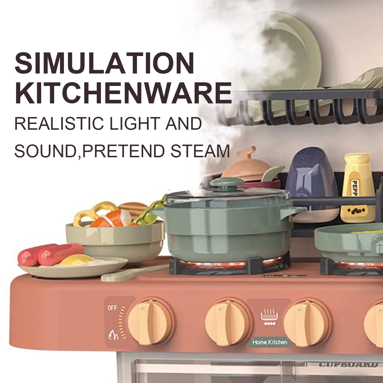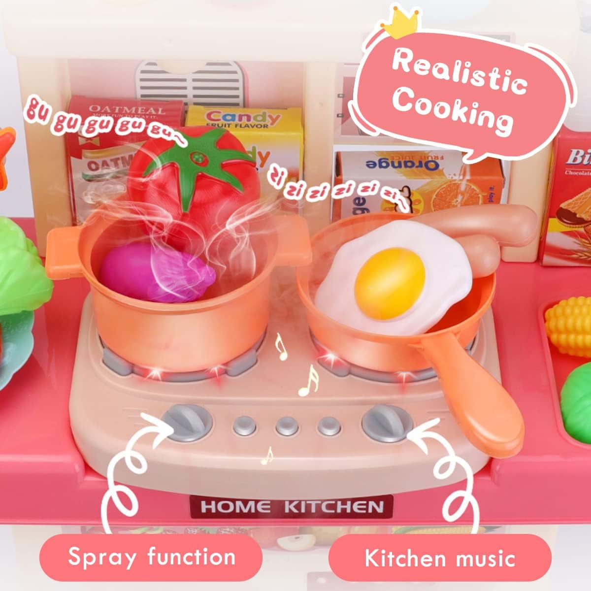 PayUSD Play Kitchen Set for Kids, 63 PCS 33Inch Pretend Play Food Toys Kitchen Set with Realistic Sounds & Lights, Play Sink, Simulation of Spray Kitchen Toys for Toddlers Girls Boys Gift, Pink