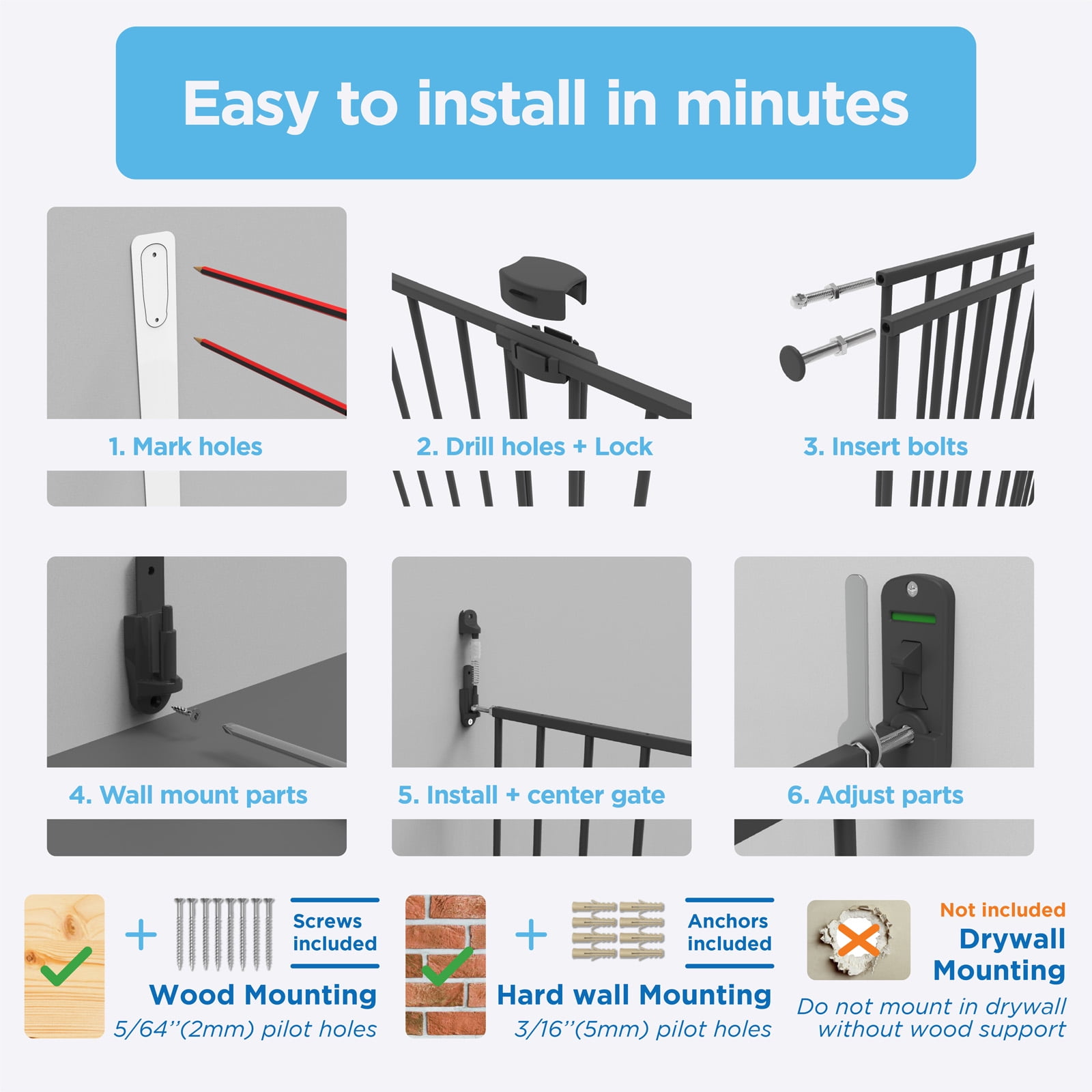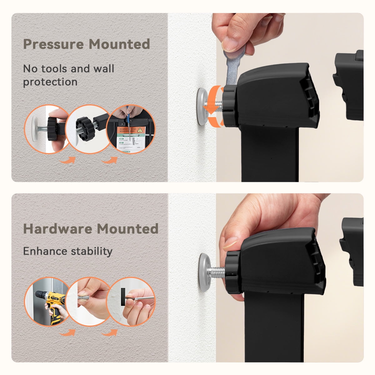 $57.73The Perma Child Safety Black Extra Tall & Wide Superior Swing Gate suits openings 32.3” – 55.9” wide and is 36” tall. Suitable for infants 6-24 months and pets 10-40 pounds, this hardware mounted gate securely mounts to the wall instead of resting on the floor like other baby gates creating a trip-hazard free installation. The integrated 2-way swing direction control is ideal for making a safe, closed off environment to play. The secure handle allows for easy one-handed operation and has a built in red/green locking indicator. Worry less with ultimate safety, all Perma Child Safety baby gates are tested to the highest safety standards, meeting or exceeding both ASTM or EN standards.