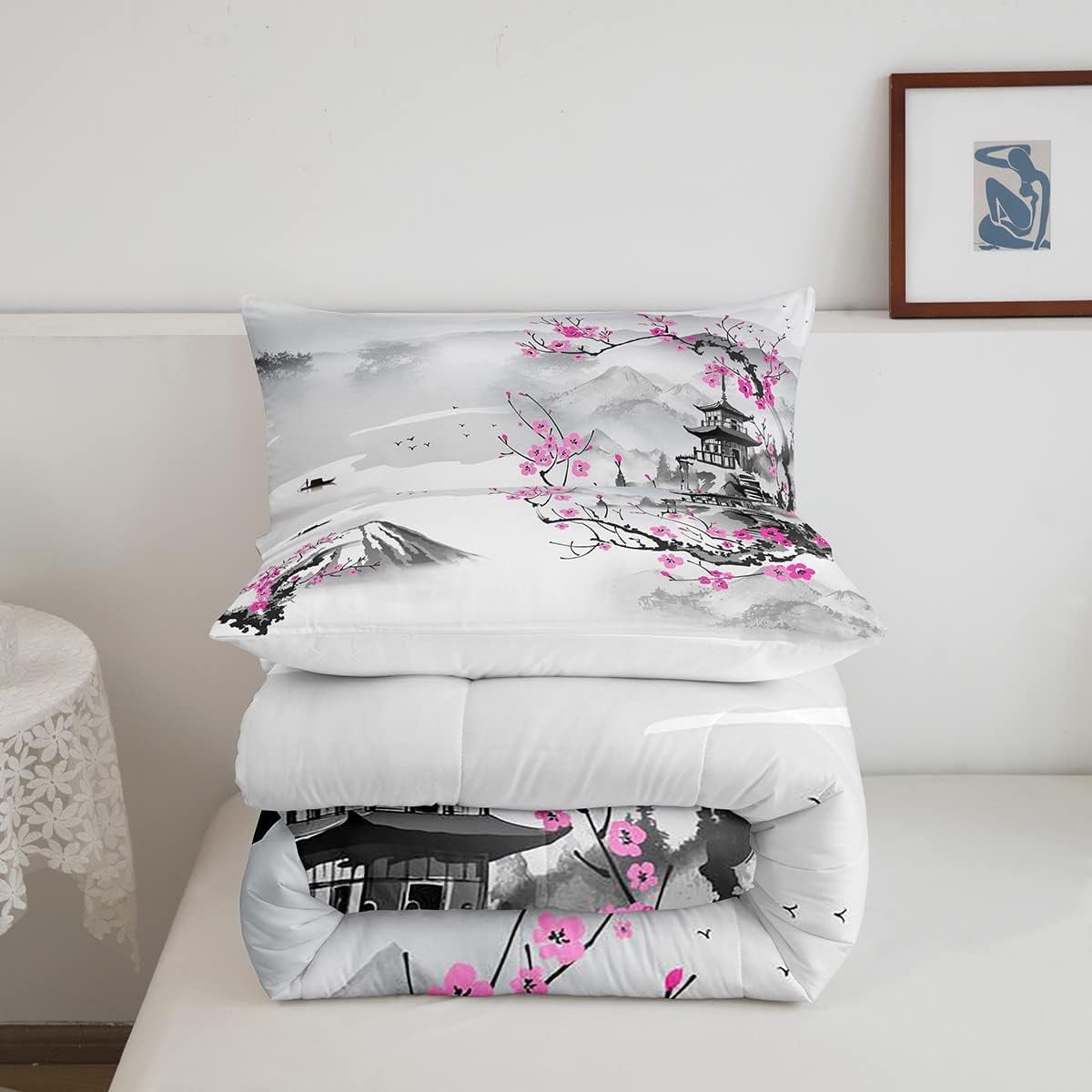 Pink Cherry Blossom Bedding Comforter Sets Women Mount Fuji Bedding Set Twin Japanese Style Duvet Insert Floral Flower Quilted Comforter White Gray Watercolor Painted Bedding, Lightweight
