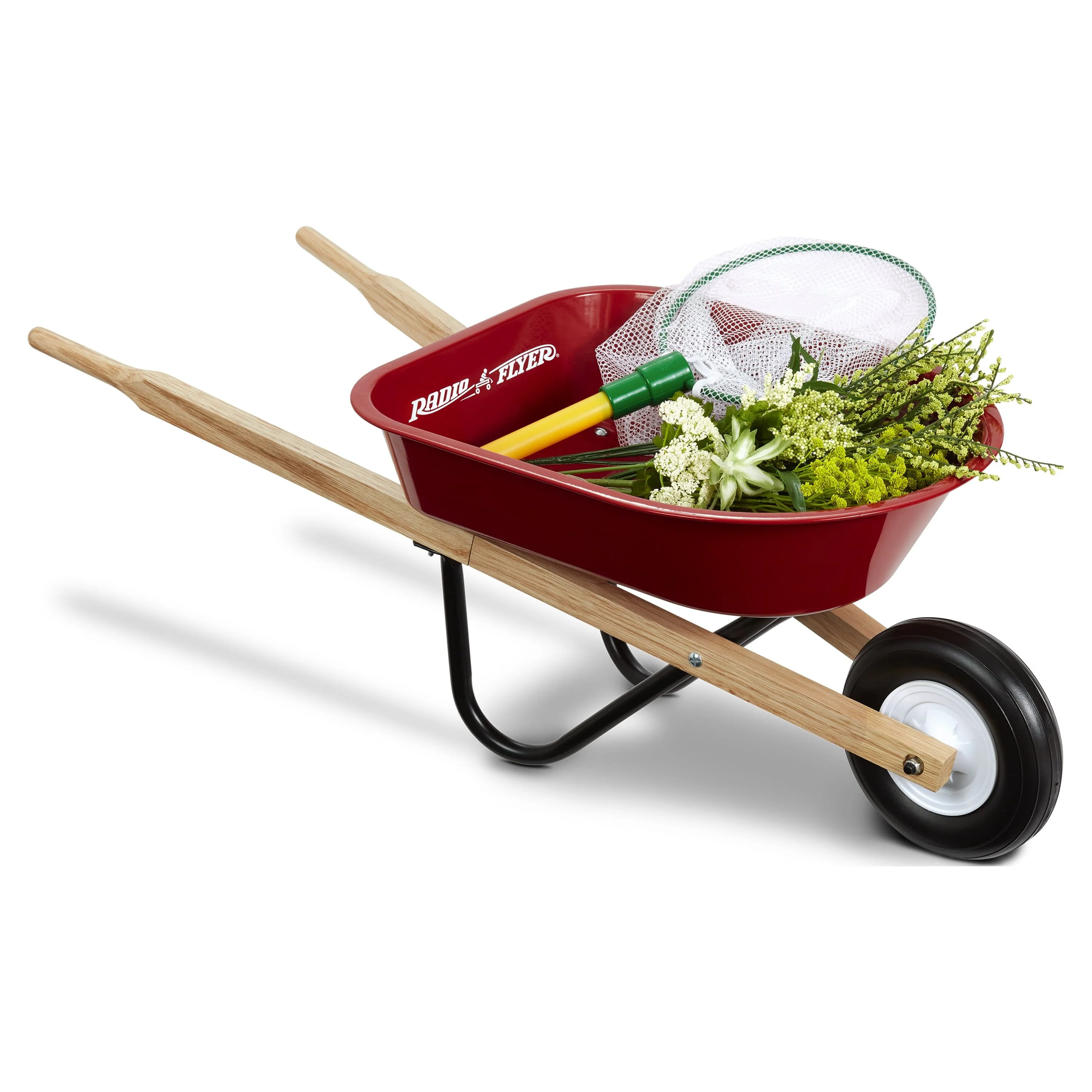 $41.27The Kid’s Wheelbarrow by Radio Flyer is as functional as it is fun! The seamless steel red tray with no-scratch edges and wooden handles make this the perfect wheelbarrow for little ones to haul their toys or help with chores in the yard. Great for beginner gardeners looking to help in the yard! The steel undercarriage provides strength and durability and the molded wheel makes this easy to push. Recommended for ages 3+ years.