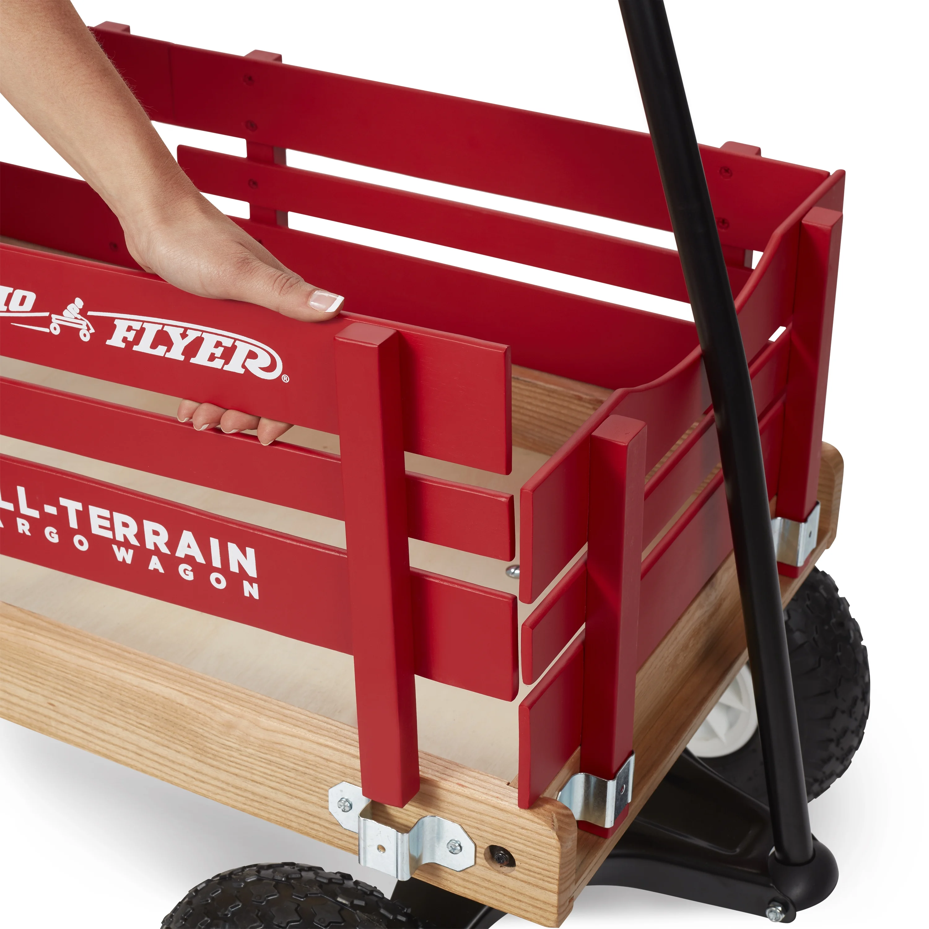 $210.22With sturdy all-steel construction rugged air tires and wooden stake sides this classic red wagon is built to handle adventures both on and off road. Radio Flyer’s All Terrain Wagon combines a classic design with the added benefit of 10? rugged air tires. These all-terrain air tires are designed to provide a smooth ride on any terrain! This wagon also features an extra-long handle that folds under for storage when not in use and has a no-pinch ball joint to keep fingers safe. Maximum weight capacity 200 lbs. Recommended for children ages 1 ½+ years.