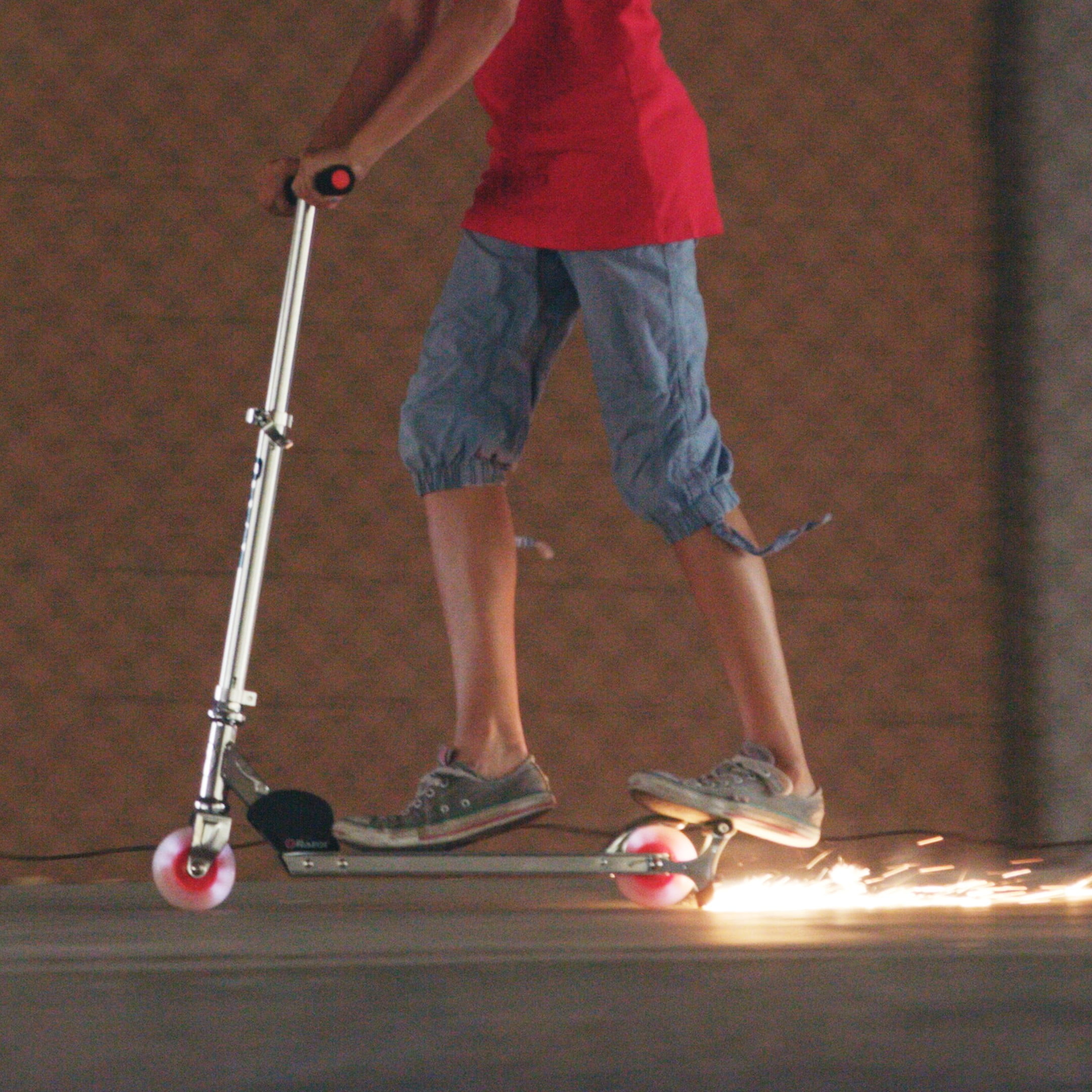 $55.89Kids can tear up the asphalt or the sidewalk in style with this Razor Spark Scooter. Made of durable aircraft-grade aluminum, it features a patented rear fender brake that allows them to stop on a dime every time. It comes with a foot-controlled, detachable bar with five flint pads that help create real and bright sparks while kids ride. The Razor scooter can be folded for convenient storage and portability. It includes rugged 98mm urethane wheels and ABEC-5 bearings for a smooth, fast ride with improved control. It also comes with a bonus replacement spark cartridge. This scooter creates 20 percent more sparks than other spark scooter brands on the market. This kids’ kick scooter can endure rough handling and is available in your choice of eye-catching colors. The handlebars are cushioned to provide comfort, even after hours of riding, and can be adjusted to suit the rider’s height.