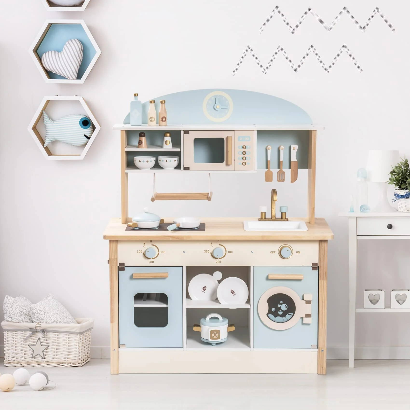 Robud Luxury Kids Play Kitchen Playset, Wooden Pretend Playset with Microwave Oven, Clock,Towel Rack,Toy for Toddler,Blue