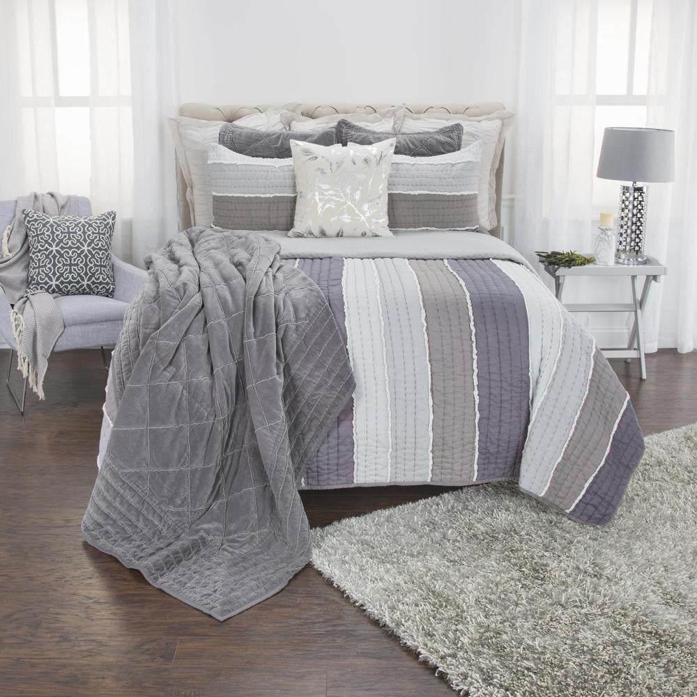 $44.28Monochromatic shades of silver gray to charcoal distinguish Olivia Grace. This cotton voile color blocked quilt features contrast heavy Kantha styled quilting. The color blocked bandings are seperated by almost white cotton jersey ruffling. This patterning is mirrored on the shams. These shams (sold seperately) are knife edged and feature a split back for ease of fill and fill removal for cleaning. That back is a coordinating solid cotton back. The quilt features the same cotton back. This quilt is a medium weight quilt. color blocked in shades of gray kantha styled hand quilting cotton jersey ruffling between color bands knife edged shams split back for ease of fill and cleaning Specifications: – Packing Time (days) : 2 – Box 1 Height : 10.00 – UPC : 844353657982 – Attribute Material : 100% Cotton – Box 1 Depth : 5.00 – Attribute Dimensions (in) : 20″x36″ – Box 1 Width : 12.00 – Brand : Rizzy Home – Box 1 Weight : 2.00 – Delivery Time (days) : 5 – Length: 5.0 in, Width: 2.0 in, Height: 10.0 in