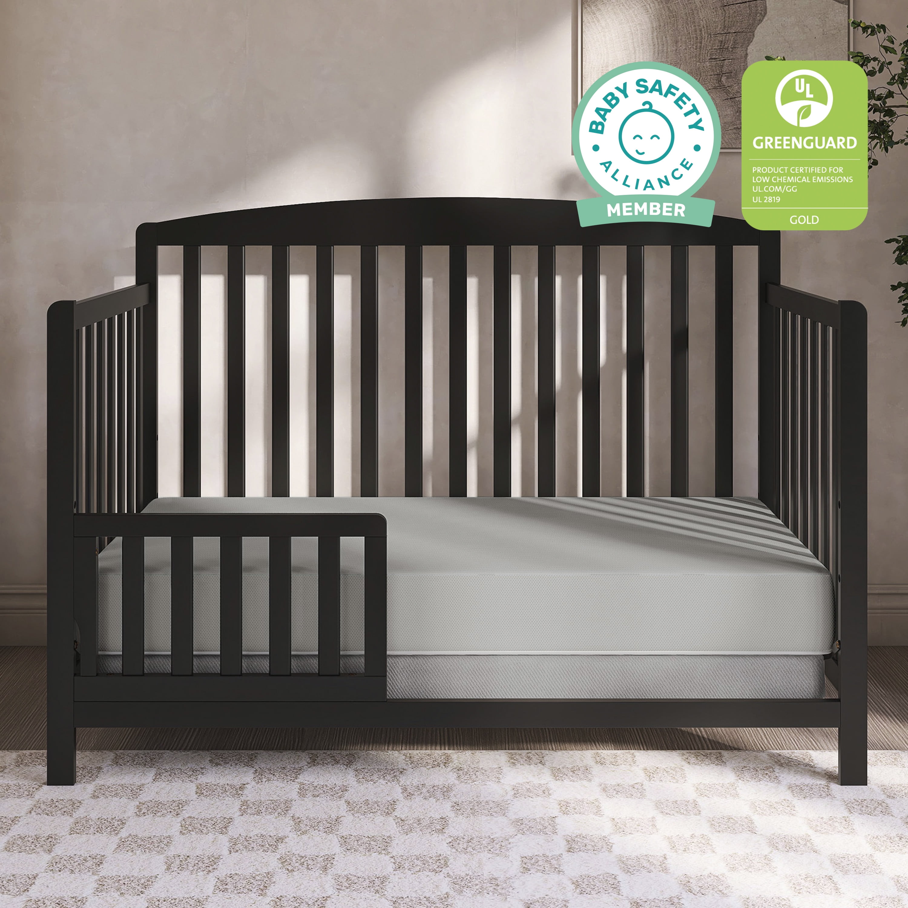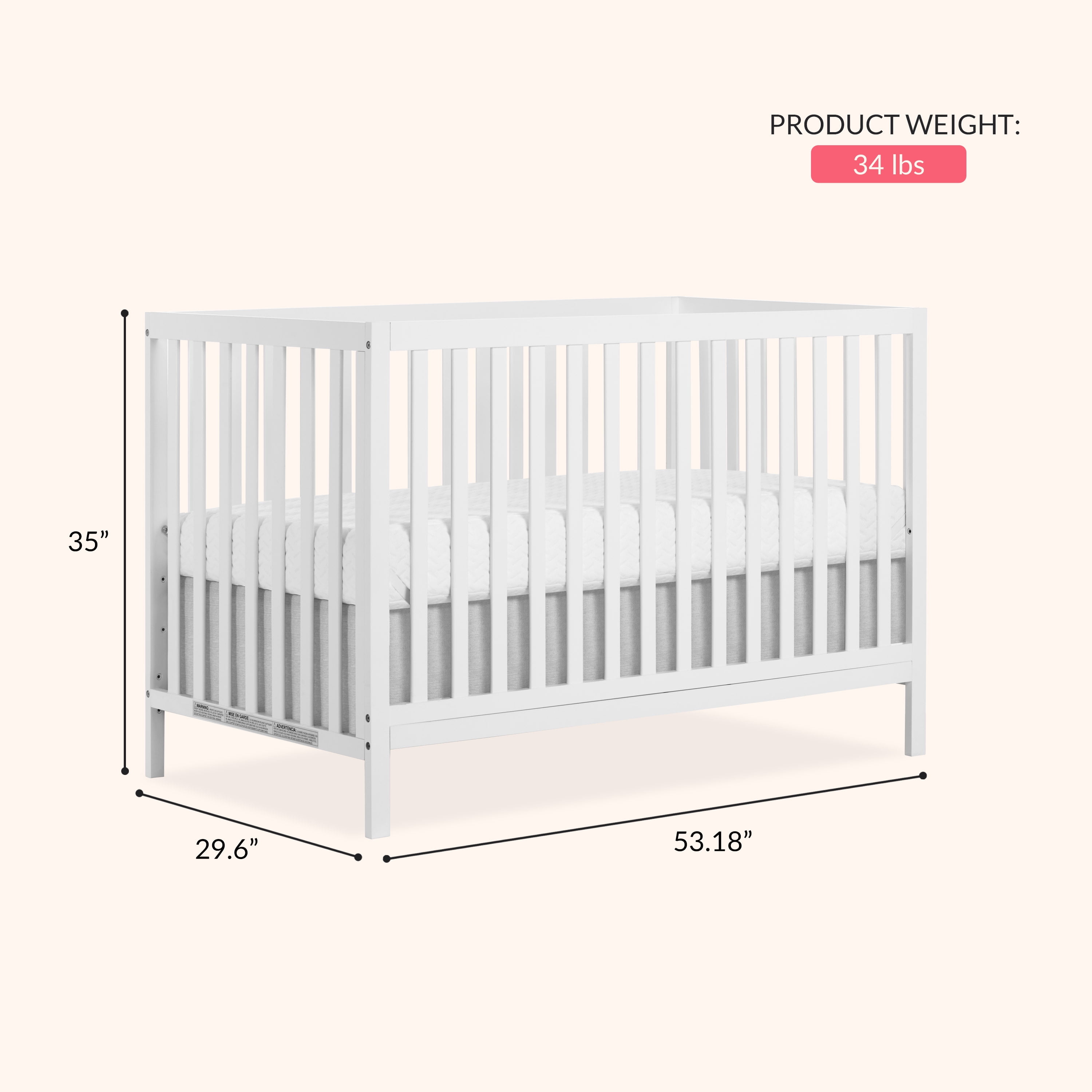 $104.05“Create a nursery space for your little one that’s easy on the eyes, for those precious moments they spend catching some Zzs. The Dream On Me Synergy MOD Crib is the perfect blend of style, functionality, and safety for your little one. It is wonderfully designed to accompany your child during every growth milestone, as it effortlessly converts from crib to toddler bed, daybed & full-size bed, accommodating their ever-changing needs. Rest easy knowing that the Dream On Me Synergy MOD Crib meets the highest safety standards, as it is both JPMA & Greenguard Gold Certified, and complies with ASTM/CPSC standards. Crafted from sustainable New Zealand pinewood, featuring wooden spindles and a metal mattress support, this crib ensures both durability and stability. The Dream On Me Synergy MOD Crib comes in 5 beautiful finishes – White, Espresso, Natural, Cool Grey, and Matte Black, that allow you to create the nursery of your dreams – contemporary, whimsical, fairy, vintage – let your imagination reign supreme! Product Dimensions are 53.18″” L X 29.6″” W X 35″” H, with a weight of 34 Lbs. “