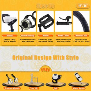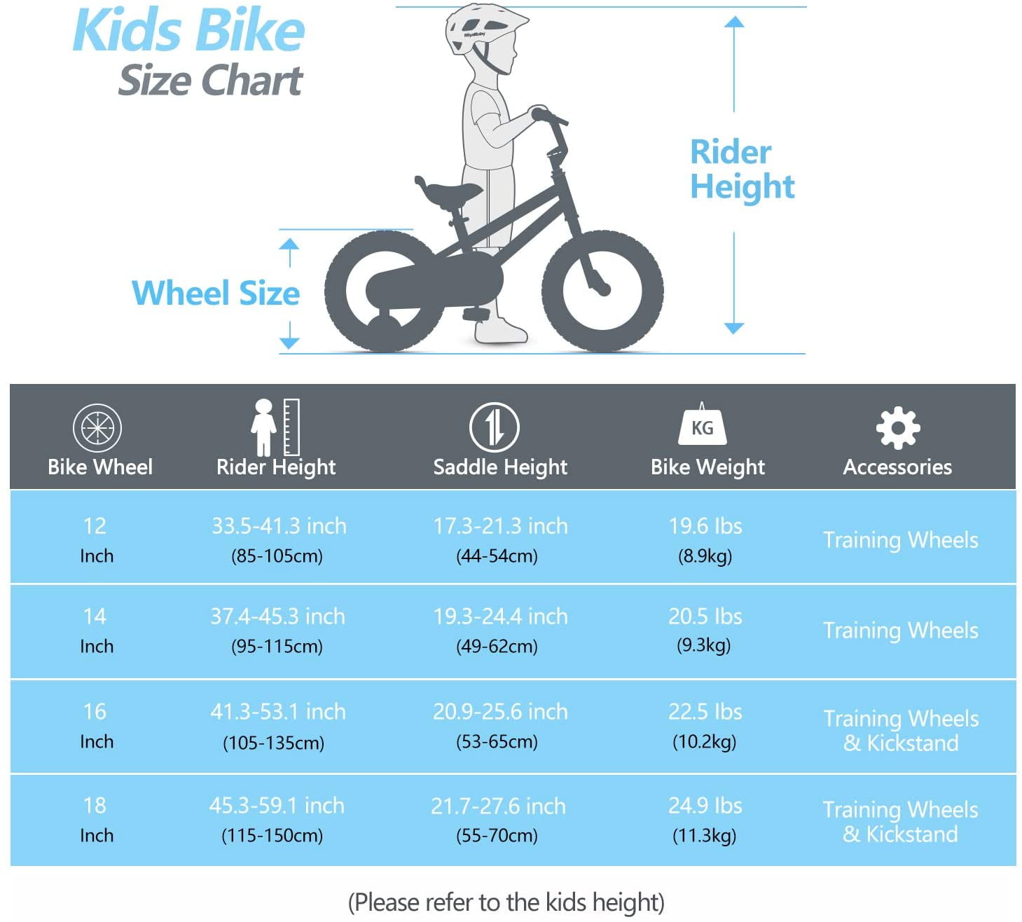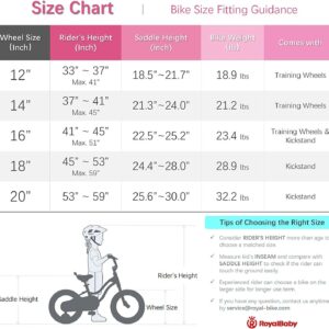 $123.47Unique Design: Steel frame, safe and stable training wheel. Front caliper brake and rear coaster brake. Adjustable bicycle handlebar and seat are suitable for children of different heights. Safety grips, soft seat, sturdy frame, enclosed chainguard, crank, brakes, nonslip resin pedal. 1.2 mm bike steel tubes thickness and 2.4” wide tires. Accessories: This kid’s bike comes with a bell, a DIY decal, training wheels for 12/14/16/18 inches, kickstand for 16/18 inches, and bike front white reflector/rear red reflector. The handlebars and seat height are all adjustable. Use our easy-to-follow size chart, you’ll find a perfect size. Note: Please take the kid’s height into consideration.