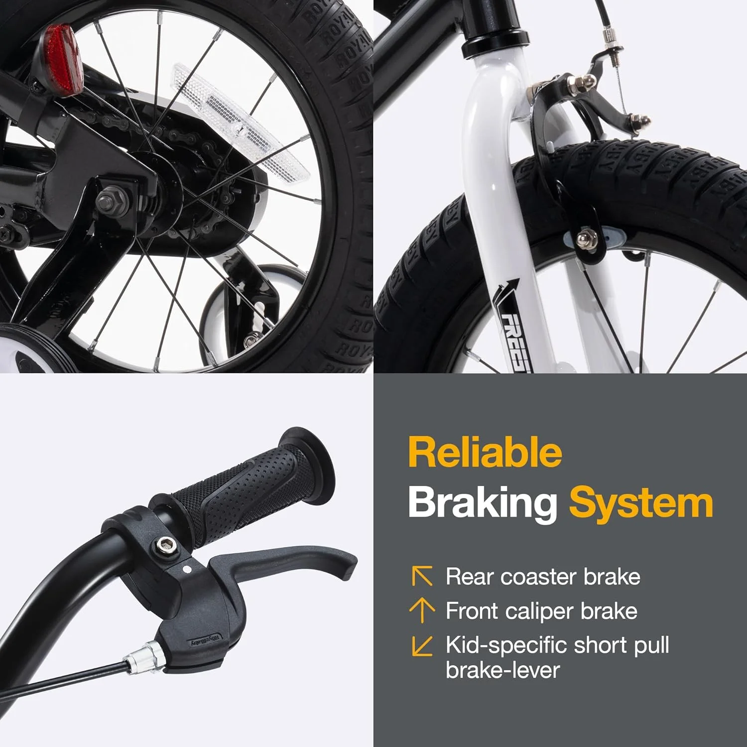 $163.39RoyalBaby 18″ FreeStyle Coaster Brake Bike Timeless design. Quality components. Easy riding. The RoyalBaby 18″ FreeStyle was designed with inspiration from the BMX spirit; It’s all about fun, creativity, freedom, and friends. With kids in mind, the Freestyle is a timeless design with RoyalBaby-specified kids’ geometry components that is perfect for the next cycling star! The bike comes 95% pre-assembled, with an elaborate instruction manual and all tools needed in the box. Compared to other commonly seen 85% pre-assembled bikes, the Freestyle is easier to put together and more robust during transportation due to structural integrity. RoyalBaby bikes comply with the CPSC standards and are trusted by millions of families in more than 80 countries globally.