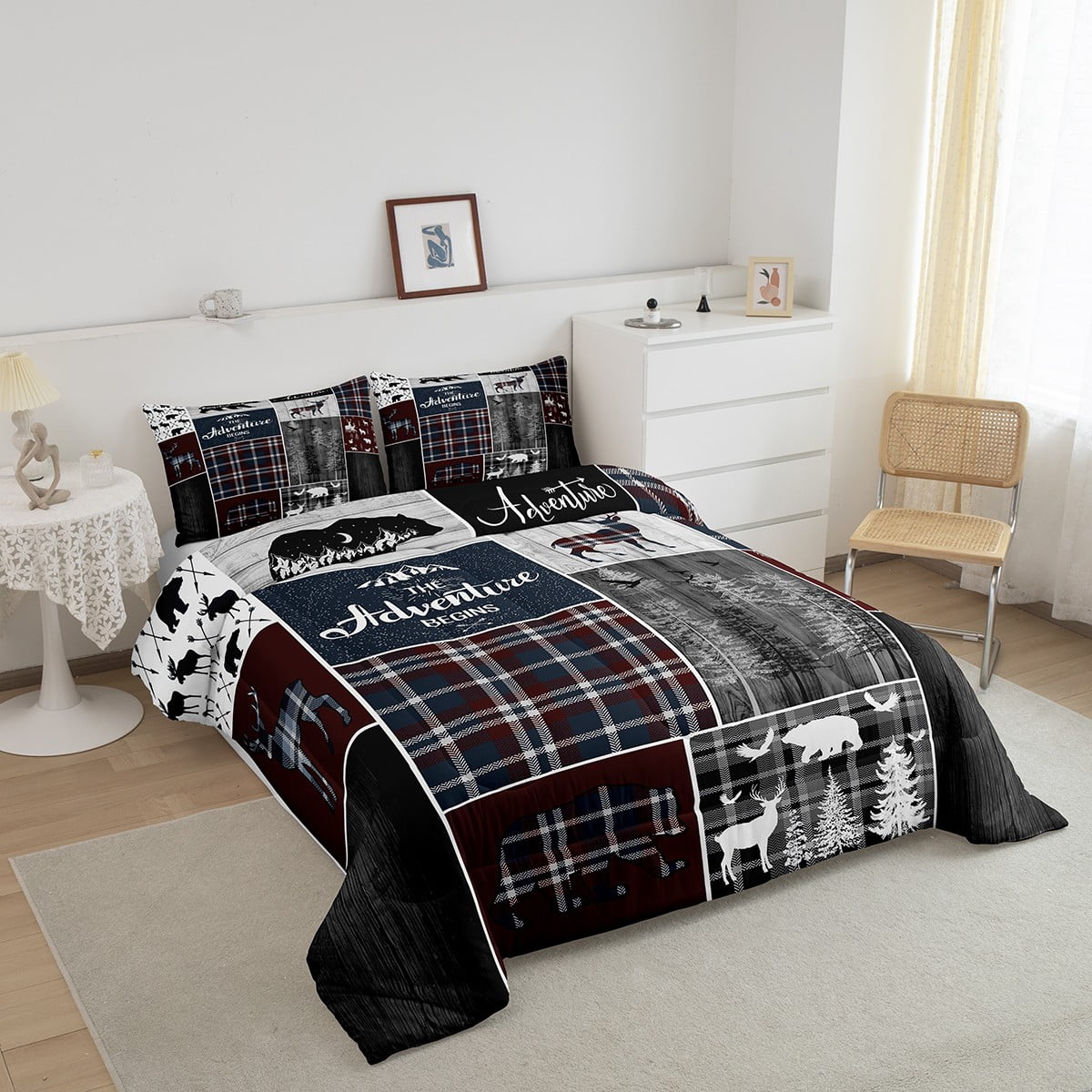 Rustic Cabin Lodge Comforter Set, Bear Deer Wildlife Quilt Full Size, Country Forest Hunting Wild Animal Bedding Retro Plaid Checkered Patchwork Down Comforter Farmhouse Decorations, Grey Black