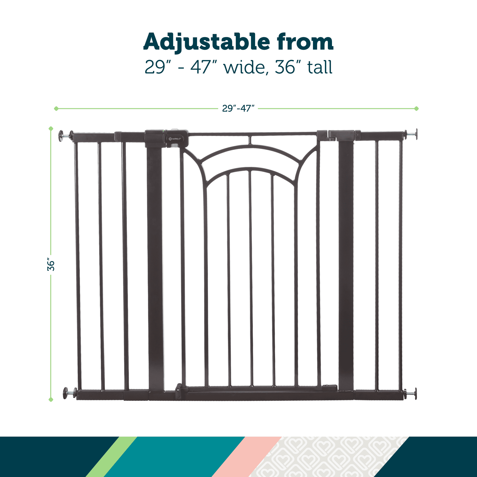 $68.78Now that baby is on the move, the Safety 1st Easy Install Décor Tall & Wide Gate makes it simple to create child friendly areas within your home and has a modern finish that blends in seamlessly with your home décor. For use between rooms, a walk-through gate makes it easy to get around the house, with no need to reinstall it each time you pass by. This gate features SecureTech®, our red-to-green indicator on the top rail that allows you to see when your gate is securely locked. Pressure-installed gates provide flexibility in usage around the home. Wall cups stay installed to the wall while the gate can easily be removed for periods of non-use. An extra-wide gate lets you easily block off the larger throughways in your home. The gate is 36 inches high and can be adjusted from 29 to 47 inches. The Safety 1st Easy Install Decor Tall & Wide Gate’s design provides additional height protection that isn’t just great for kids. It comes in handy when you’re trying to keep pets out of certain rooms as well. Safety 1st believes parenting should have fewer worries and more joyful moments. As the first and only leader in child safety, Safety 1st is here to give you peace of mind so you can spend less time worrying and more time enjoying every first you experience with your child.