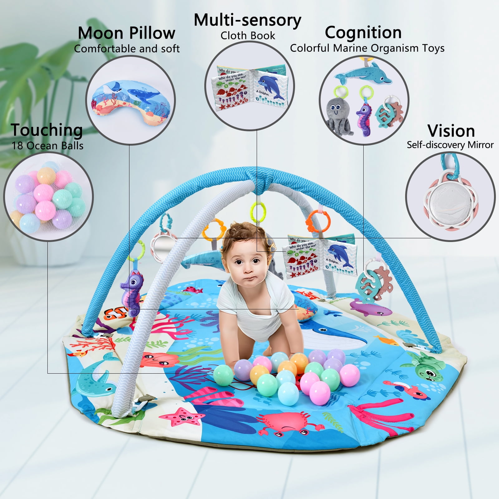 $42.98This multifunctional 5-in-1 baby activity fitness pad provides ample space for babies to explore and play freely, promoting visual, auditory, and tactile stimulation. It is made of high-quality, phthalate free materials with anti slip function, ensuring a safe and comfortable environment on various floor types. It has 7 detachable sensory toys, including high contrast cloth toys, a noisy cloth book, toy balls, grip toys, a self discovery mirror, and a belly time pillow, meeting comprehensive development needs. It is easy to machine wash and suitable for indoor/outdoor use, providing a comfortable and charming space for babies’ growth and play.