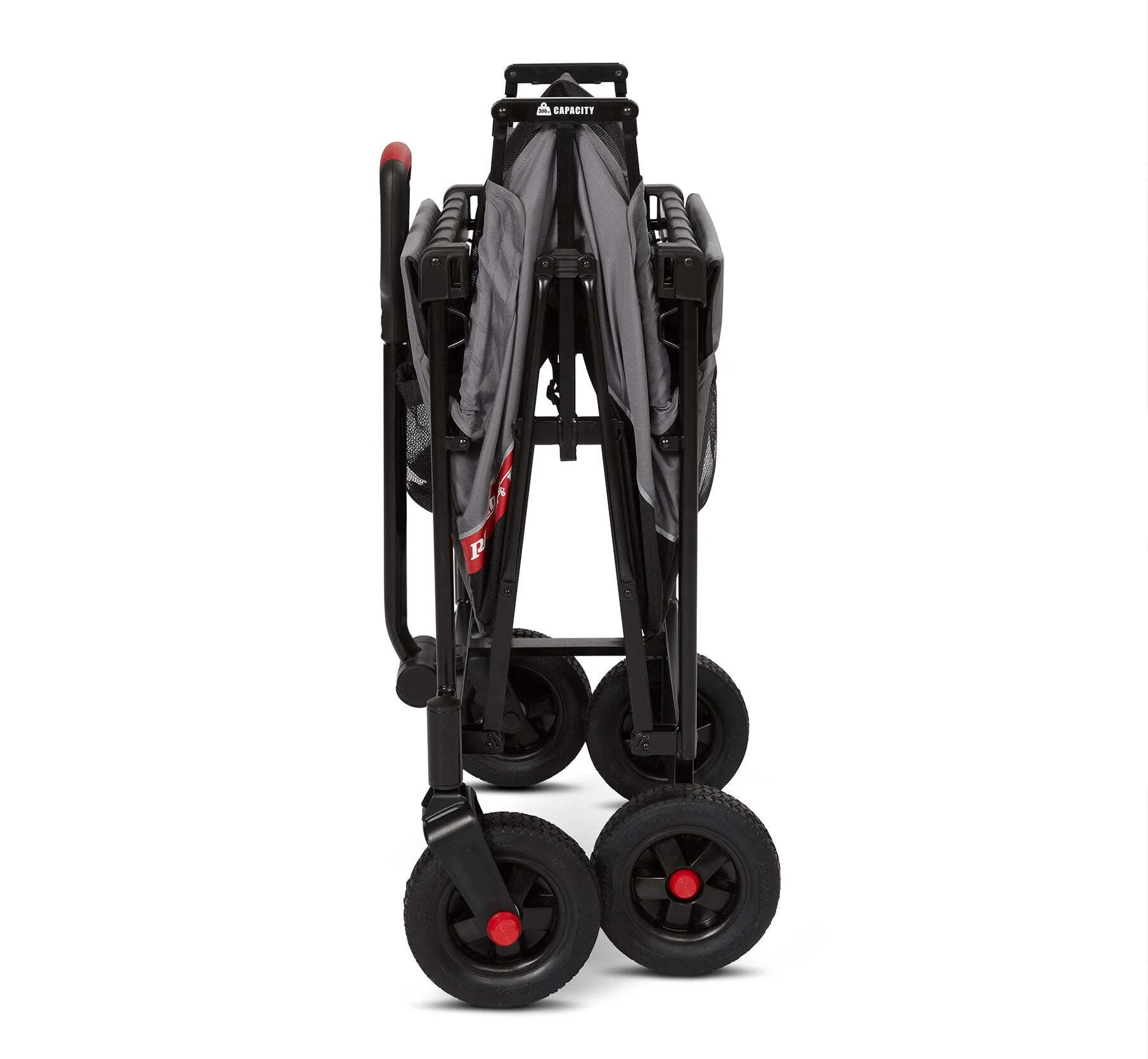 $130.71● Heavy-duty utility wagon for kids and cargo ● Extra-tall front and rear sides to haul large cargo like tents, chairs, etc. ● Mesh sidewalls for flexible hauling ● Padded seatback for kid’s comfort ● Off-road puncture proof tires ● Easy one hand fold, folds flat for easy storage Discover the ultimate cargo and kid hauler: The Beast MVP! This versatile utility wagon combines durability and comfort to haul up to 300 pounds. The mesh sidewalls are flexible and keep cargo safely secured, and the extra-tall sides can support large items such as folding chairs, canopies, and more. The caster wheels with bearings provide a smooth ride on any terrain. There are 2 cupholders and a mesh rear storage pouch, along with a reflective strip for visibility. The seatback and seat bottoms are padded for kid’s comfort, and the mesh walls can be folded down for easy loading and unloading kids or cargo. The Never Fall™ handle stays upright when not in use and features a comfort grip. The Beast MVP will get the job done as the ultimate utility wagon! Recommended for ages 1½ +. Maximum weight capacity: 300 lbs.