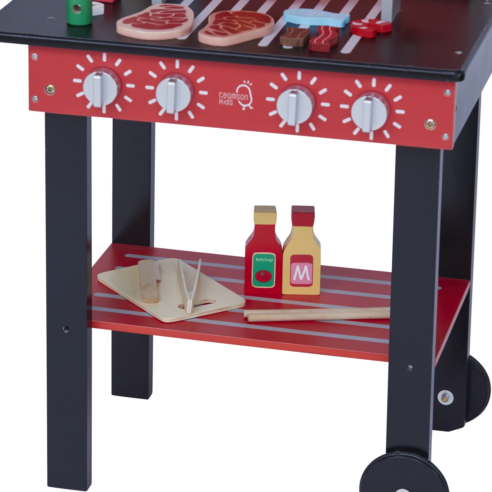 $103.10Teamson Kids Little Helper Backyard BBQ Grill Playset features a bright red and black finish with silver accents with a realistic and interactive design. This wooden playset looks like a standard propane grill with an open/close lid with a window, rotating and clicking knobs on the front of the grill, a rotating kebab spinner, and two wheels to easily move the grill. Pretend play is enhanced with the 26-piece accessories set that includes cookware, condiments, and 17 pieces of play food.