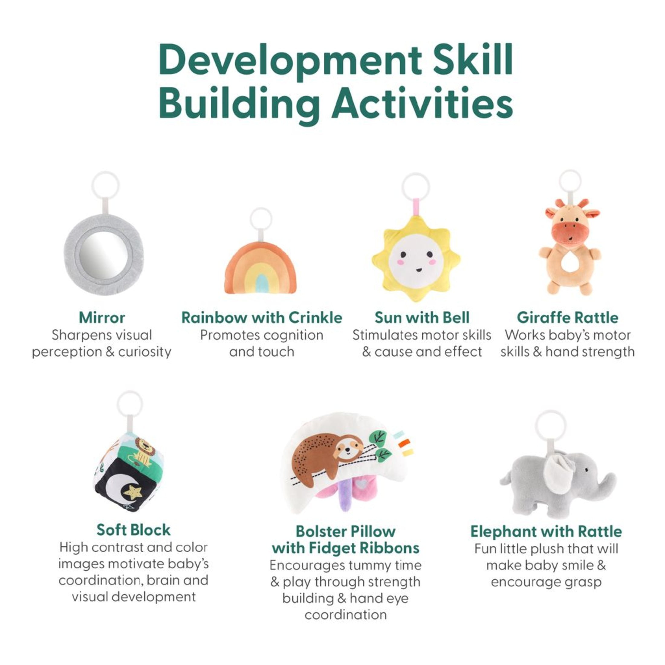 $42.99The Peanutshell 7 in 1 Baby Play Gym and Play Mat, Safari 123 is the perfect place for your baby to stretch out for stimulating tummy time! Designed to capture baby’s attention, the Safari 123 Play Gym from The Peanutshell is the ultimate spot for educational fun and entertainment. The Montessori inspired interactive mat is the perfect pad for educational fun and entertainment. Let baby’s imagination roam wild as they engage with 6 removable hanging toys and a pillow headrest. Each adorable plush piece promotes visual and auditory sensory development and encourages cause-and-effect learning. Capture baby’s curiosity as they see, hear and touch safari animals, shapes, letters, colors, numbers, and trees. From fidget ribbons, mirrors, and rattles to crinkles and bells, these interactive toys strengthen fine motor skills and enhance cognitive development. The easy-to-assemble play gym accommodates baby’s milestones through lay down, tummy time and sitting up development stages. Sturdy gray botanical crossbars and a non-skid backing ensure hours of safe play. Clean up is a breeze too, simply wipe clean with a damp cloth and fold flat for easy storage.