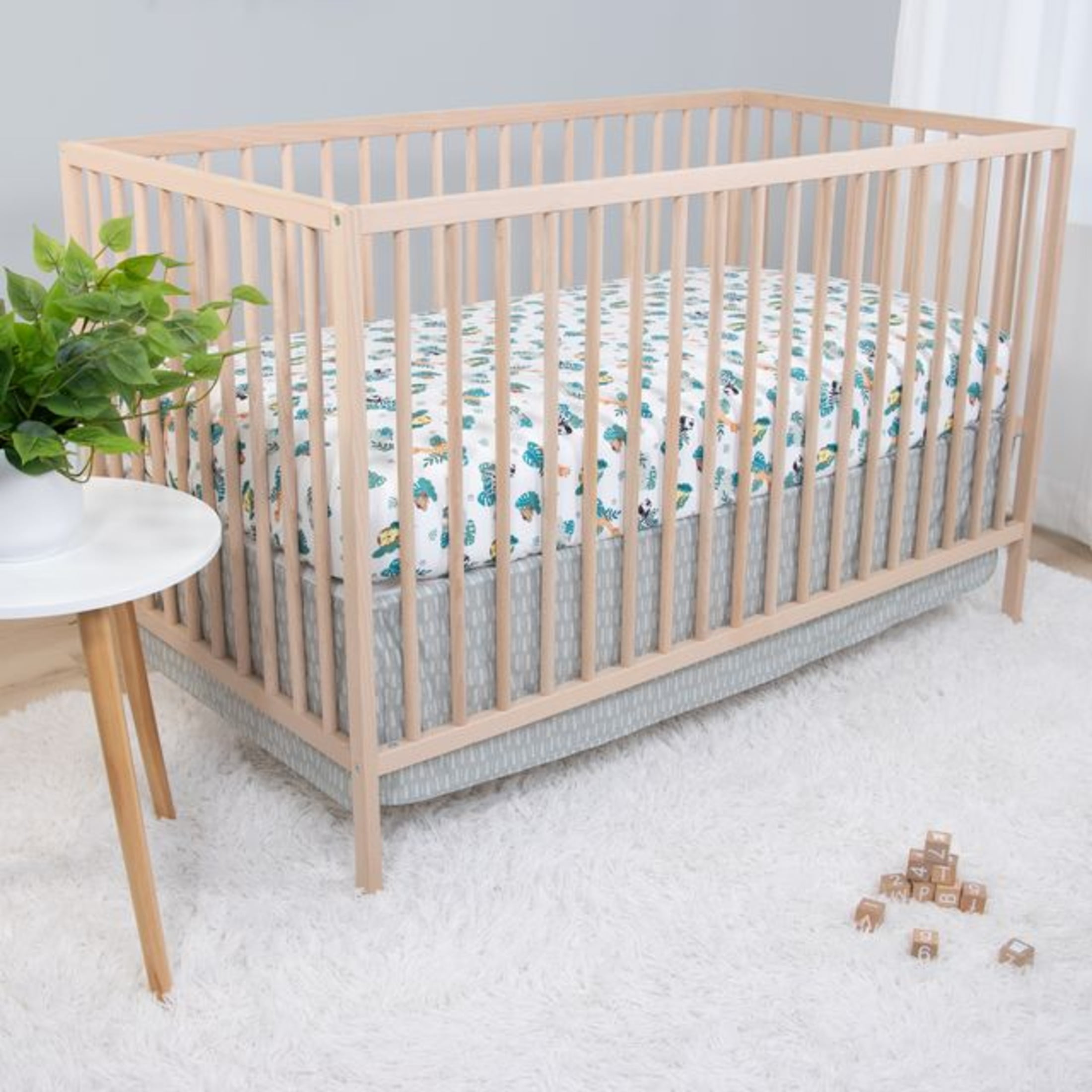 $38.69Bring all the jungle vibes right to your baby boy nursery with the 3-piece Safari Adventures baby bedding set by the Peanutshell. Our colorful, multi-functional crib quilt features an elephant, lion, monkey, and more enchanting safari animals hanging out amid leafy scenery in various shades of blue and green. A tonal gray geometric border with printed leaf detail inside perfectly frames this adorable scene. The fitted crib sheet comes in a perfect universal fit, designed for a standard 28? x 52? crib mattress with snug fitting all around elastic. The crib sheet is a soft and stylish allover pattern of bright, colorful jungle animals and leaf clusters. The tonal gray geometric print bed skirt rounds out the look. Coordinate this set with our other jungle themed nursery decor, crib mobiles and sheet set to complete your Safari Adventures bedroom.