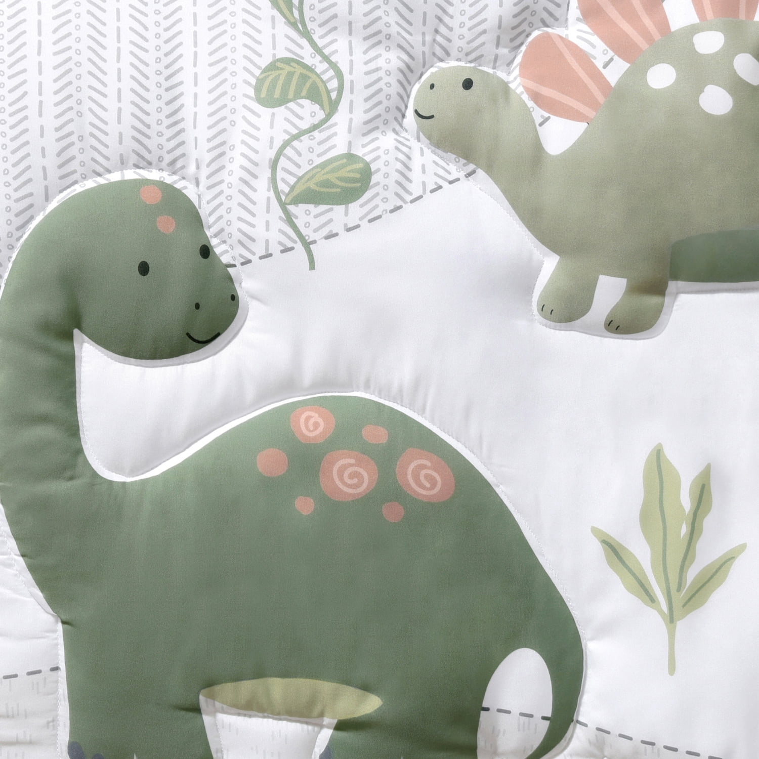 $38.69Create a prehistoric paradise with the Dinosaur Dreams 3-Piece Bedding Set from The Peanutshell. This collection showcases playful dino pals in a lush landscape of green, gray, and earthy brown tones. The set includes a fitted crib sheet with durable elastic, a cozy 32″ x 41″ quilt, and a coordinating printed bed skirt. Tumble dry on low heat to maintain the vibrant colors and softness. Pair it with our dinosaur musical mobile and other Peanutshell items for the complete look.