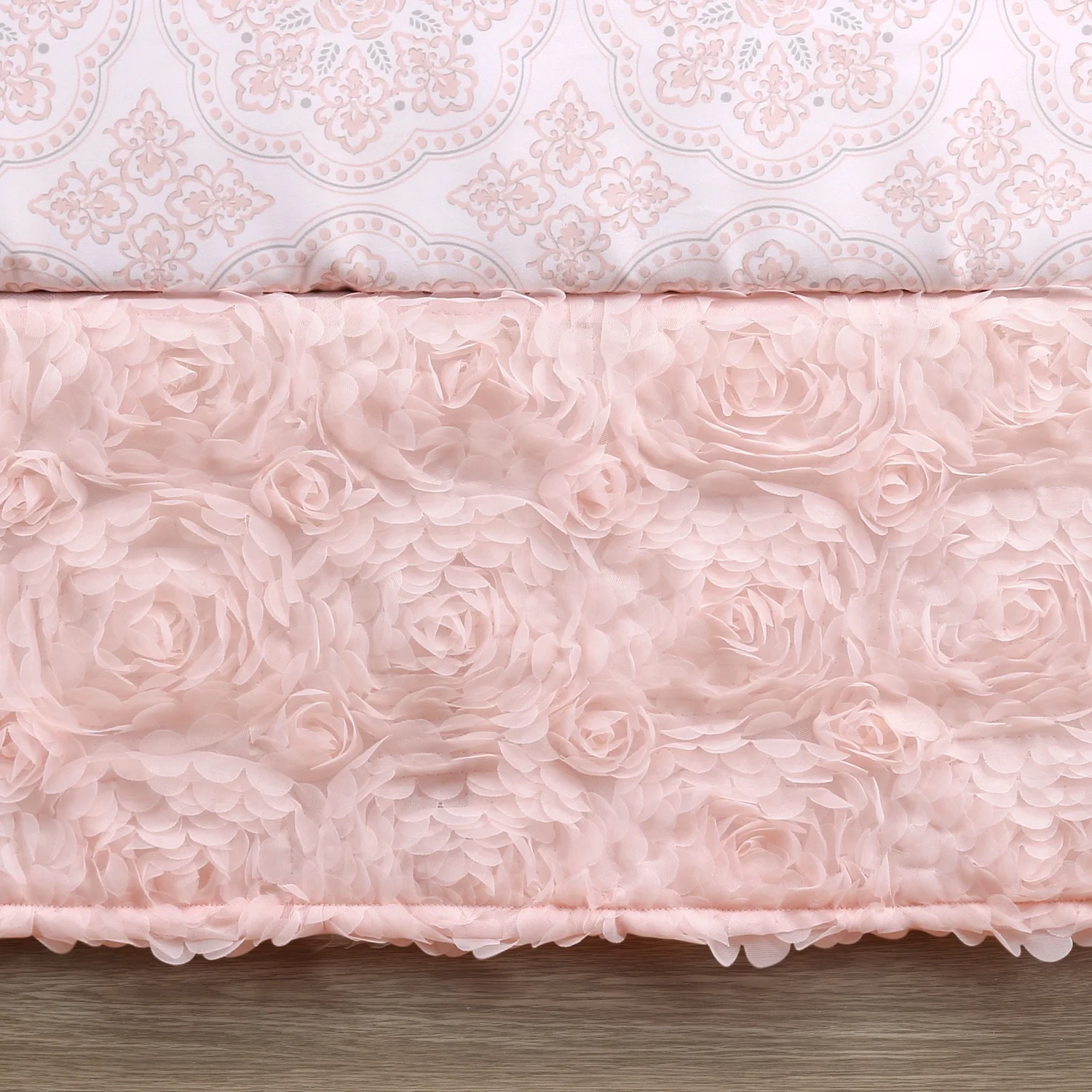 $68.79Original price was: $68.79.$51.59Current price is: $51.59.The delightful Arianna bedding collection from the Peanutshell will create a gorgeous nursery for your little princess. This 3 piece baby crib bedding set features an array of opulent fabrics, such as pink taffeta, an embroidered white dot, pink chiffon, and ultra soft microfiber. Includes a quilt embellished with delicate chiffon rosettes, a beautiful medallion print sheet, and stunning rosette-covered sheer dust ruffle. Dust ruffle and fitted sheet are designed to fit standard crib and mattress.